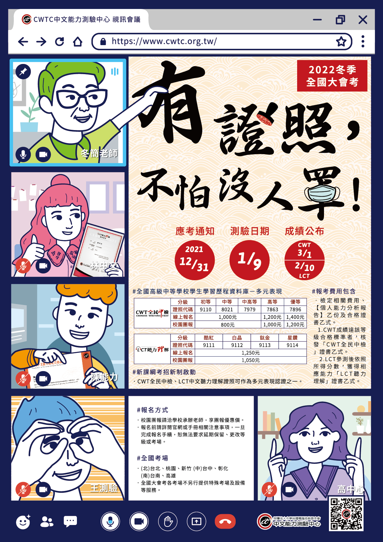 二、 「CWT 全民中檢」、「LCT 中文聽力理解檢定」為全國唯一通過教育部民間推薦採認之中文類證照,同時上述兩測驗證照亦於「全國高級中等學校學生學習歷程資料庫」認列為多元表現之證明,將有助校內學生升學備審資料的語文能力展現。證照代碼如下: