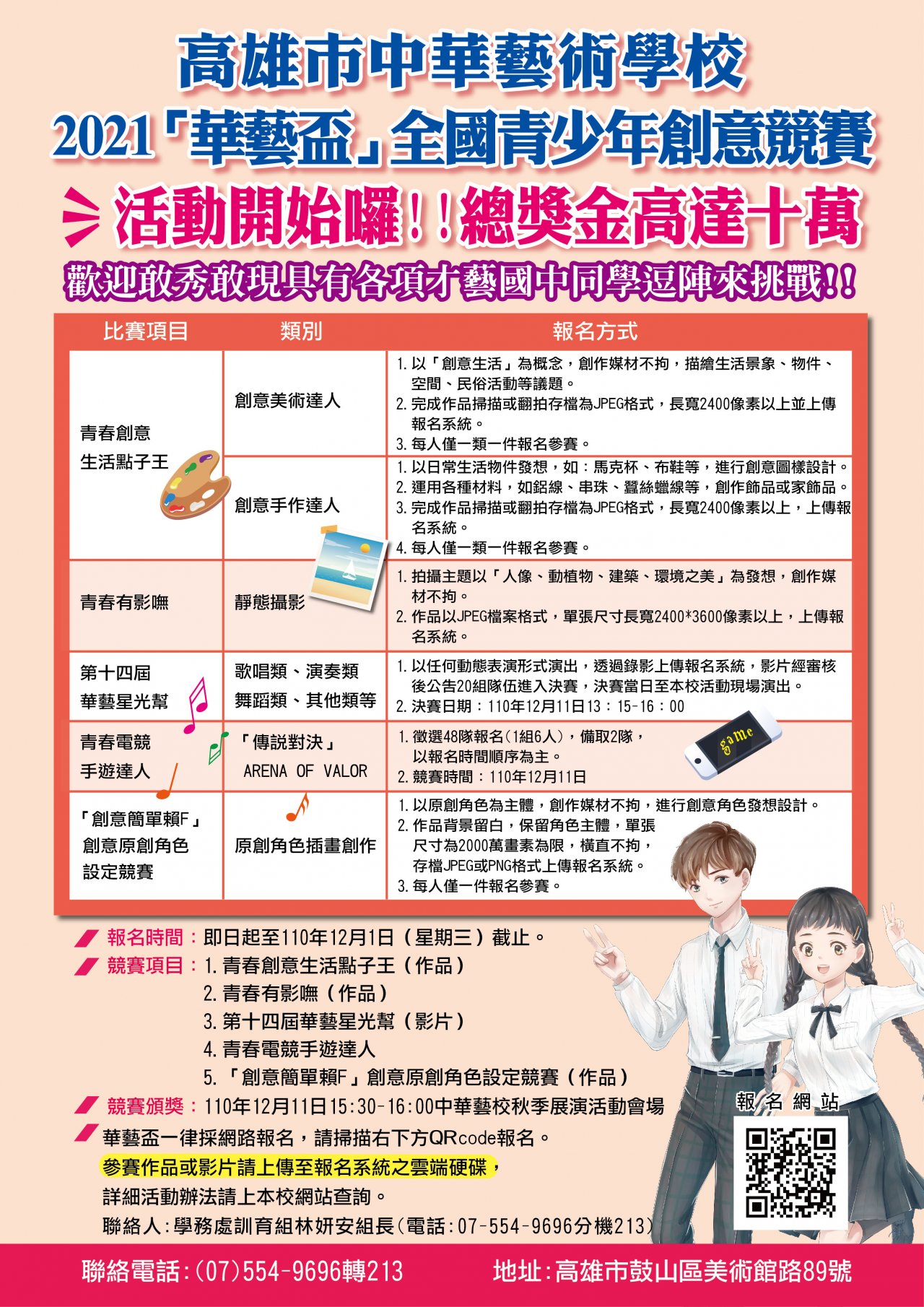 一、據教育部國民及學前教育署 110 學年度第 1 學期「高職優質 化輔助方案」110 年 7 月 8 日臺教授國部字第 1100079508A 號 函辦理。 二、活動內容:提供青少年表演舞台,發揮年輕學子的創意點 子,凡公私立學校國中生只要敢秀敢現,具有各項才藝的 同學們一同來參賽,獎金優渥,歡迎前來挑戰。 三、參賽辦法: (一)參加對象︰全國公私立國中學生。 (二)活動地點︰線上徵件以及本校北校區秋季展演會場。 (三)活動日期︰線上報名徵件 110 年 12 月 1 日(三)截止。 (四)報名方式︰一律採線上網路報名,電話報名恕不受理。 (如有中華藝校學生推薦,請在報名網路表單上註明)。 (五)報名網址: https://forms.gle/ZtBWJfyAEpVwMEJH8 ,或 掃描 QR code 報名。(六)競賽項目:參賽作品或影片請上傳至報名系統之雲端硬 碟。 1、青春創意生活點子王(線上作品) 2、青春有影嘸(線上作品) 3、第十四屆華藝星光幫(初審影片;複審視疫情狀況滾動 式調整活動會場比賽或是影片複審) 4、青春電競手遊達人(視疫情狀況,滾動式調整活動會場 比賽或是線上賽) 5、「創意簡單賴 F」創意原創角色設定競賽(線上作品) 四、【華藝星光幫才藝競賽】及【青春電競手遊達人】,競賽 入圍活動會場參賽為 110 年 12 月 11 日(六)舉辦。 五、相關競賽規程訊息請至活動網站:http://www.charts.kh edu.tw/activity-record/2020exhibit1/index.html 查詢 六、得獎與入圍名單於 110 年 12 月 8 日(星期三)當日公佈於中 華藝術學校網站首頁。 七、檢附 2021 年「華藝盃」全國青少年創意競賽活動辦法及活 動 DM 乙份,敬請協助宣導公告。 八、本活動視疫情發展隨時因應調整,屆時如遇實體演出取 消,將採以線上賽比賽方式辦理。