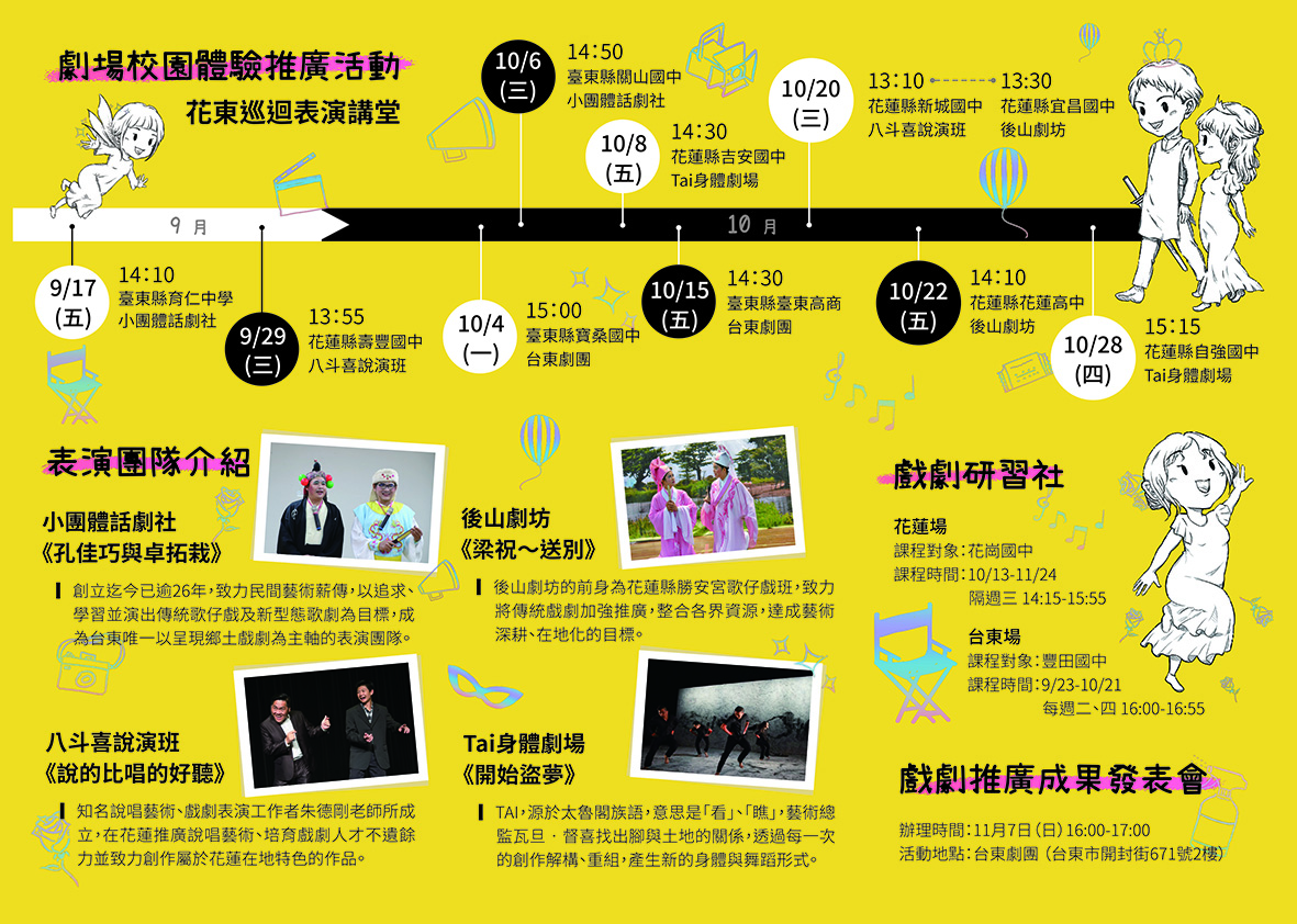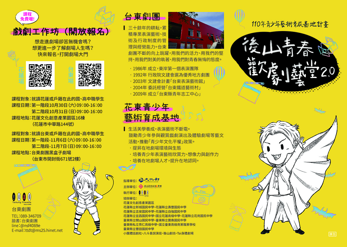 為配合場館防疫措施,每梯次上限為 30 人 五檢附「110 青少年藝術育成基地計畫-後山青春歡劇藝堂 2.0」宣傳摺頁電子檔供參考。