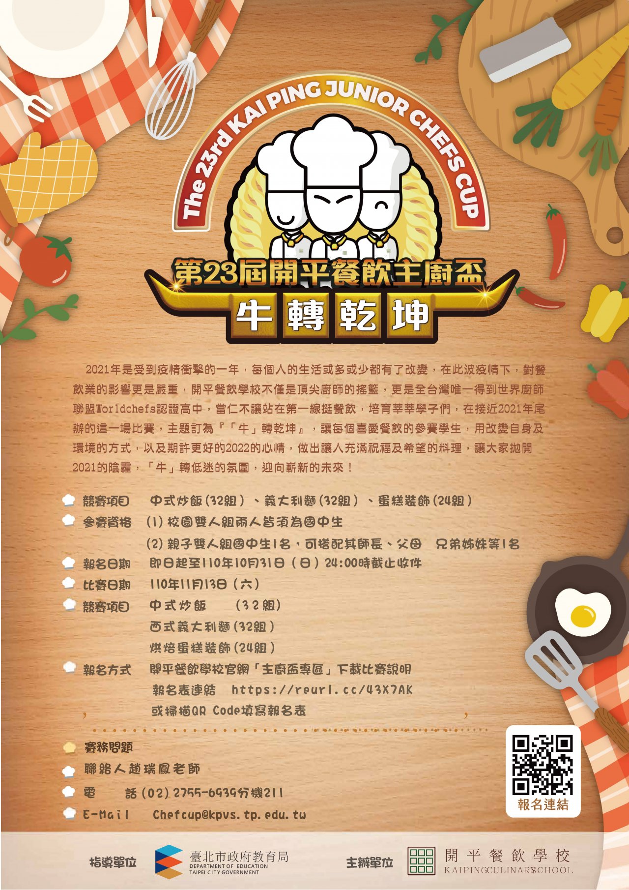 一、本次活動目的: (一)提升餐飲文化向下紮根。 (二)開啟親子互助合作平台,增進家庭親子關係。 (三)認識餐飲教育,提供職涯探索。 二、本屆比賽項目:分「中式炒飯」、「義大利麵」、及「蛋糕 裝飾」三項。藉由『「牛」轉乾坤』主題,邀請對餐飲有 興趣的國中生,發揮創作力,製作出讓人充滿祝福及希望 的料理,讓大家拋開陰霾,「牛」轉低迷的氛圍,迎向嶄 新的未來! 三、比賽時間: 110 年 11 月 13 日 (六)08:00-15:00 時四、比賽地點:臺北市開平餐飲學校 五、報名時間:即日起至 110 年 10 月 31 日(星期日) 六、相關比賽辦法,報名資訊隨函檢附,詳細比賽規則請參閱 本校網頁(http://www.kpvs.tp.edu.tw 或逕洽聯絡人:趙瑞鳳老 師,連絡電話: 02-2755-6939 轉 211