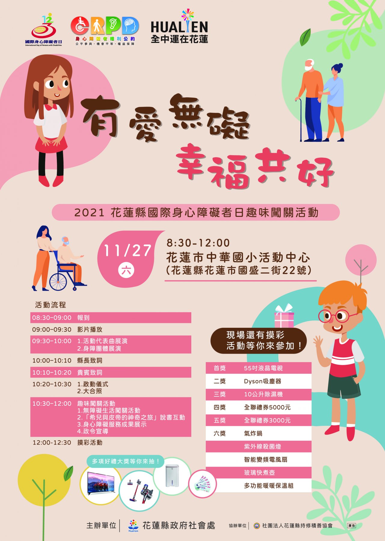 一、為響應每年 12 月 3 日聯合國頒訂的「國際身心障礙者日」及 落實推動「身心障礙者權利公約」,打造友善社會,營造 共融社會。 二、本活動以三大主軸為主,分別為「無障礙生活闖關活 動」、「『希兒與皮帝的神奇之旅』繪本說故事活動」、 「身心障礙服務成果展示」,現場透過 VR 、圖卡、拼圖、 繪本等多元媒材體驗不同障礙類別日常生活暨身心障礙福 利推動成果展示,現場備有闖關限量好禮及摸彩活動精美 大禮,誠摯邀請共襄盛舉。