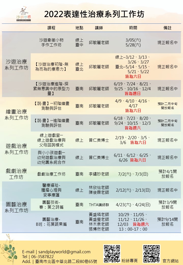 詳細時程表請見附件,若欲報名請上 http://www.sandplayworld.com.tw ,加入會員後報名。
