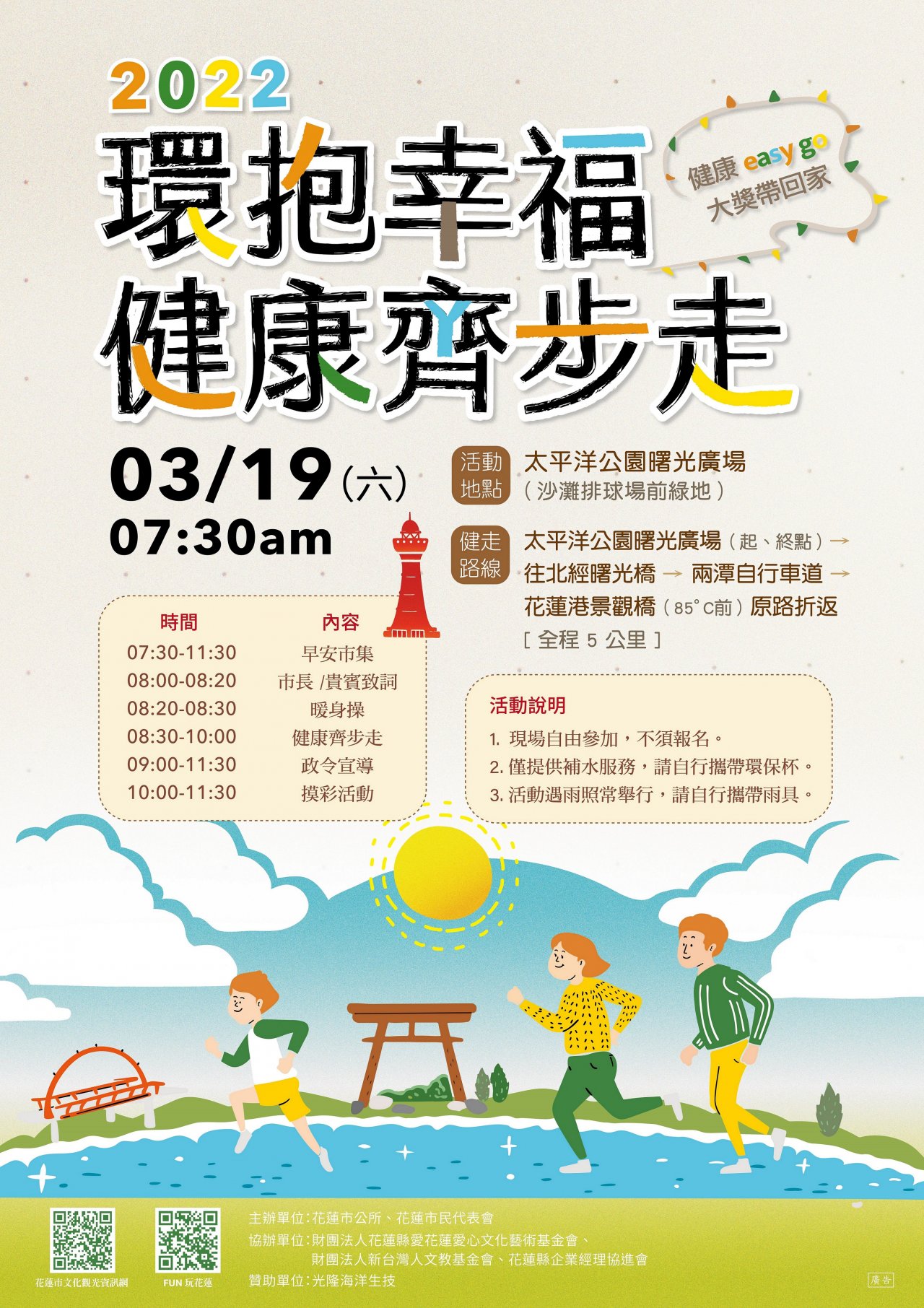 一、本活動係為培養市民運動風氣,提升戶外運動意願,藉由 舉辦健走活動,提供市民聯絡家庭情感,享受與家人、朋 友一起在自然清新的空氣下運動的健康生活,增進身體機 能。 二、活動資訊 (一)時間: 111 年 3 月 19 日(週六)上午 7 時 30 分。 (二)地點:太平洋公園曙光廣場(北濱沙灘排球場前綠 地)。 (三)更多活動資訊請至花蓮市文化觀光資訊網查詢 ( https://reurl.cc/X4a4V7 )