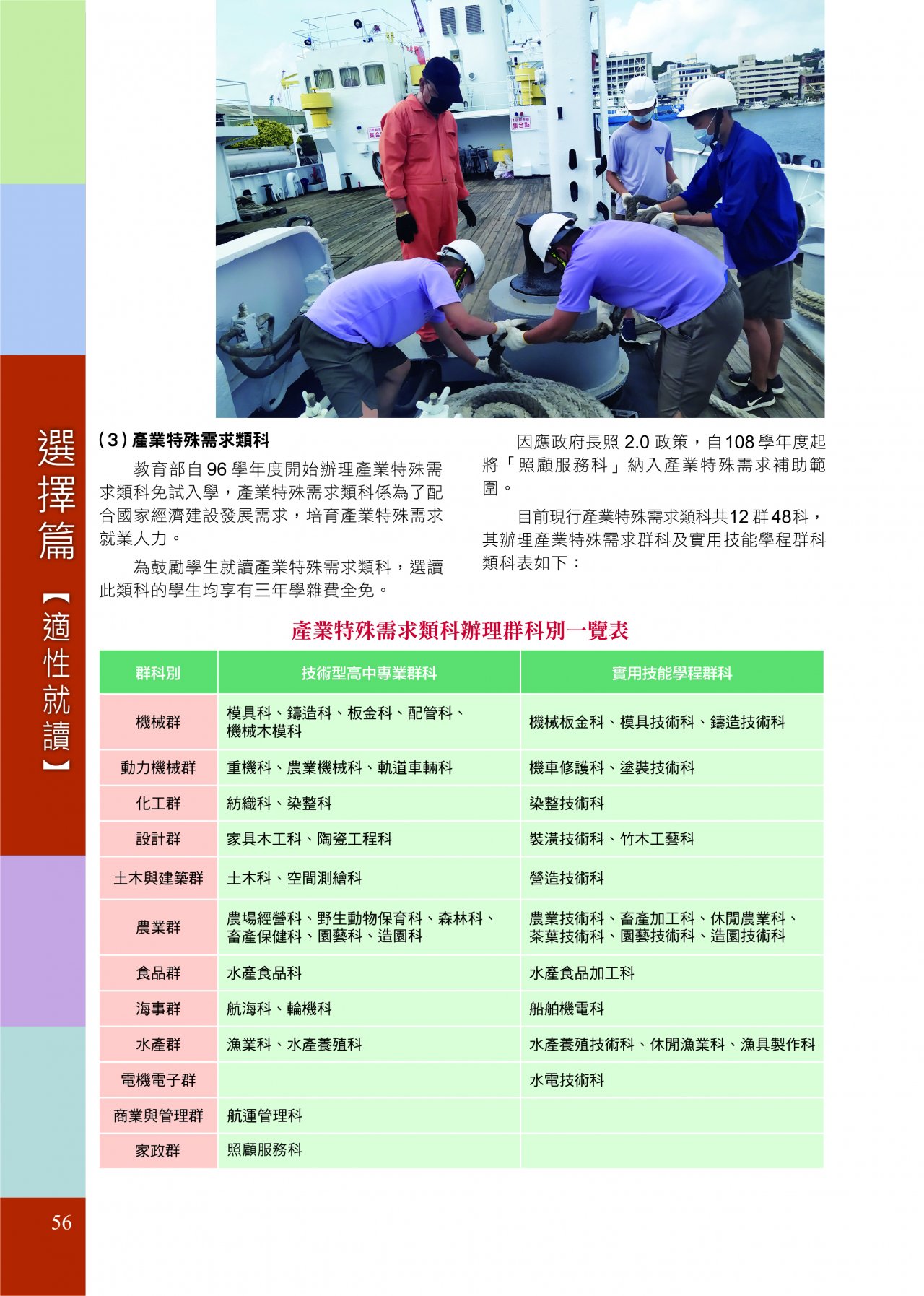 • 旨揭宣導手冊第 56 頁,產業特殊需求類科辦理群科別一覽表,技術型高中專業群科之家政群「家政服務科」係誤植,更正為「照顧服務科」,如附件。