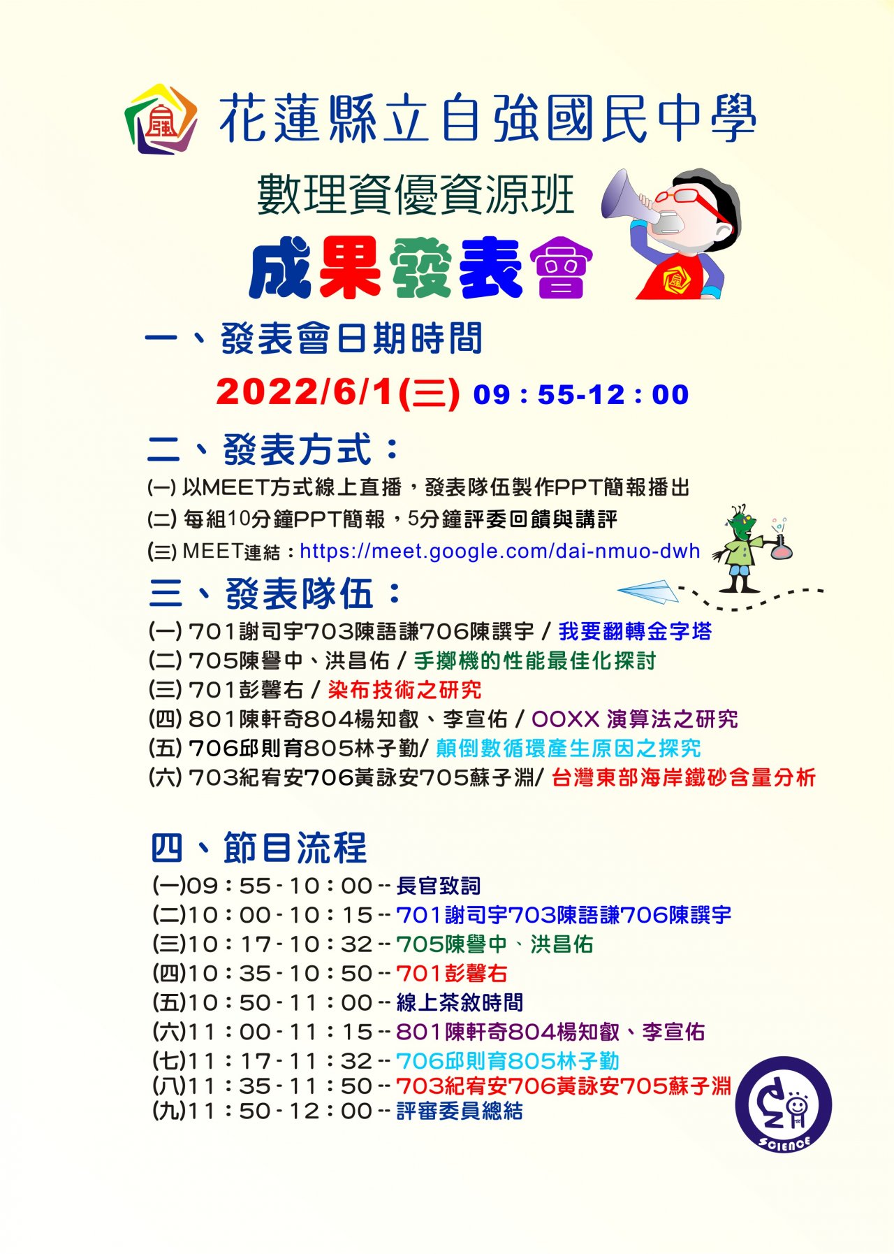 一、辦理時間: 2022/6/1(星期三)上午 9 時 55 分至 12 時。