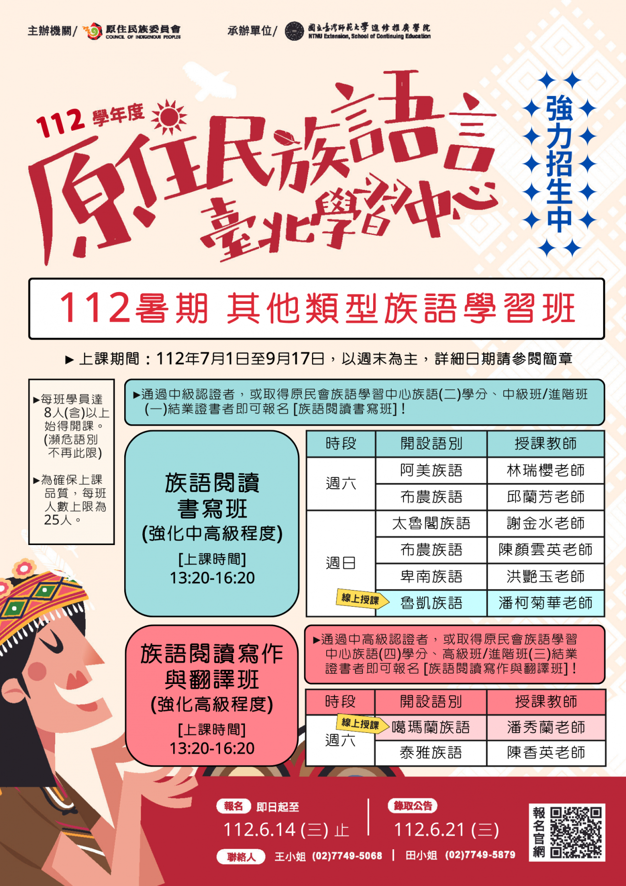 | 三、 | 招生對象為凡有意願學習原住民族文化及語言者,或欲參加原住民族語言能力認證之中高級或高級考試者。 |