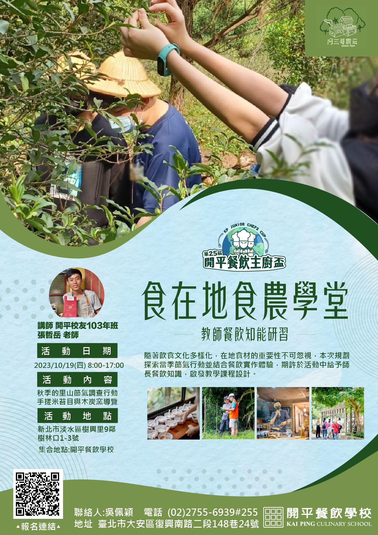 | 四、 | 報名方式:採線上報名,請上”全國教師在職進修資訊網”報名,課程名稱:食在地食農學堂-教師餐飲知能研習,課程代碼: 4043835 。報名截止日期: 2023/10/15,課程名單將於開課前三天確認遴選名單。 |