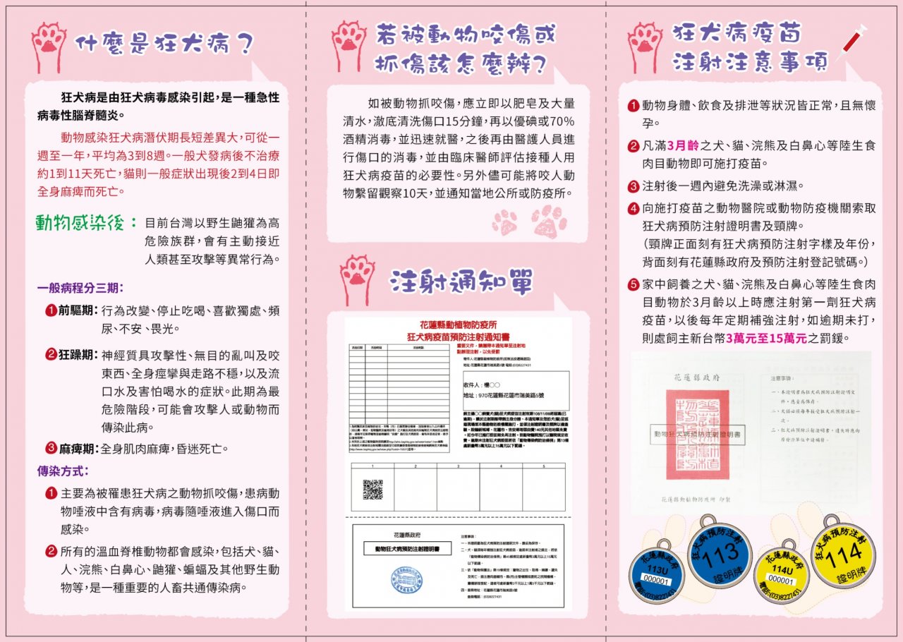 三、 狂犬病防疫宣導音檔、海報及宣導單張等資料,請各校至花蓮縣動植物防疫所網站( https://acdc.hl gov.tw/cp.aspx?n=34687 )下載或索取,後續也會陸續製作越南語、泰語及印尼語等語言版本。