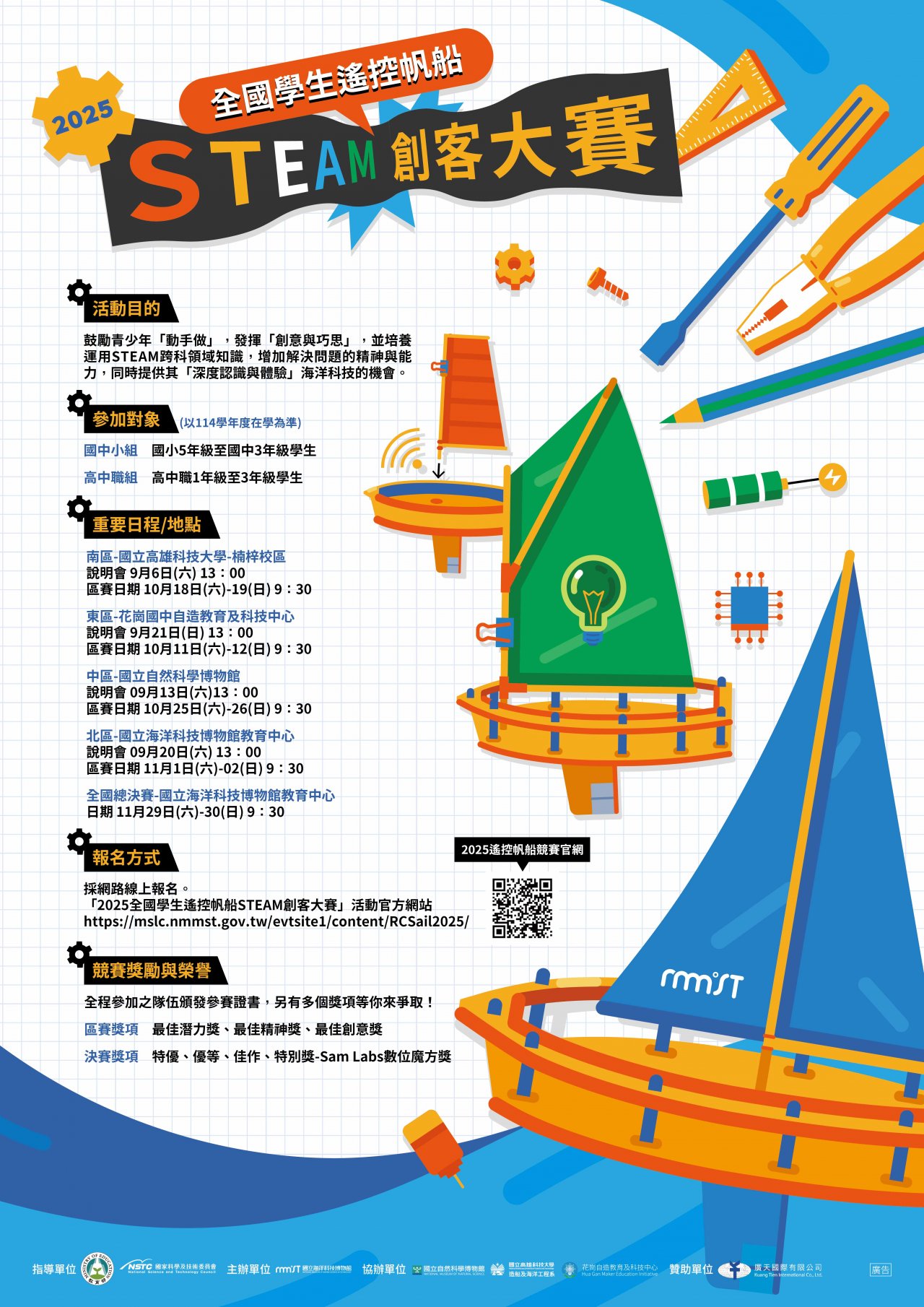 四、 活動詳情與報名請參閱活動簡章,或至「2025 全國學生遙控帆船 STEAM 創客大賽」活動官網 https://mslc.nmmst.gov.tw/evtsite1/content/RCSail2025/