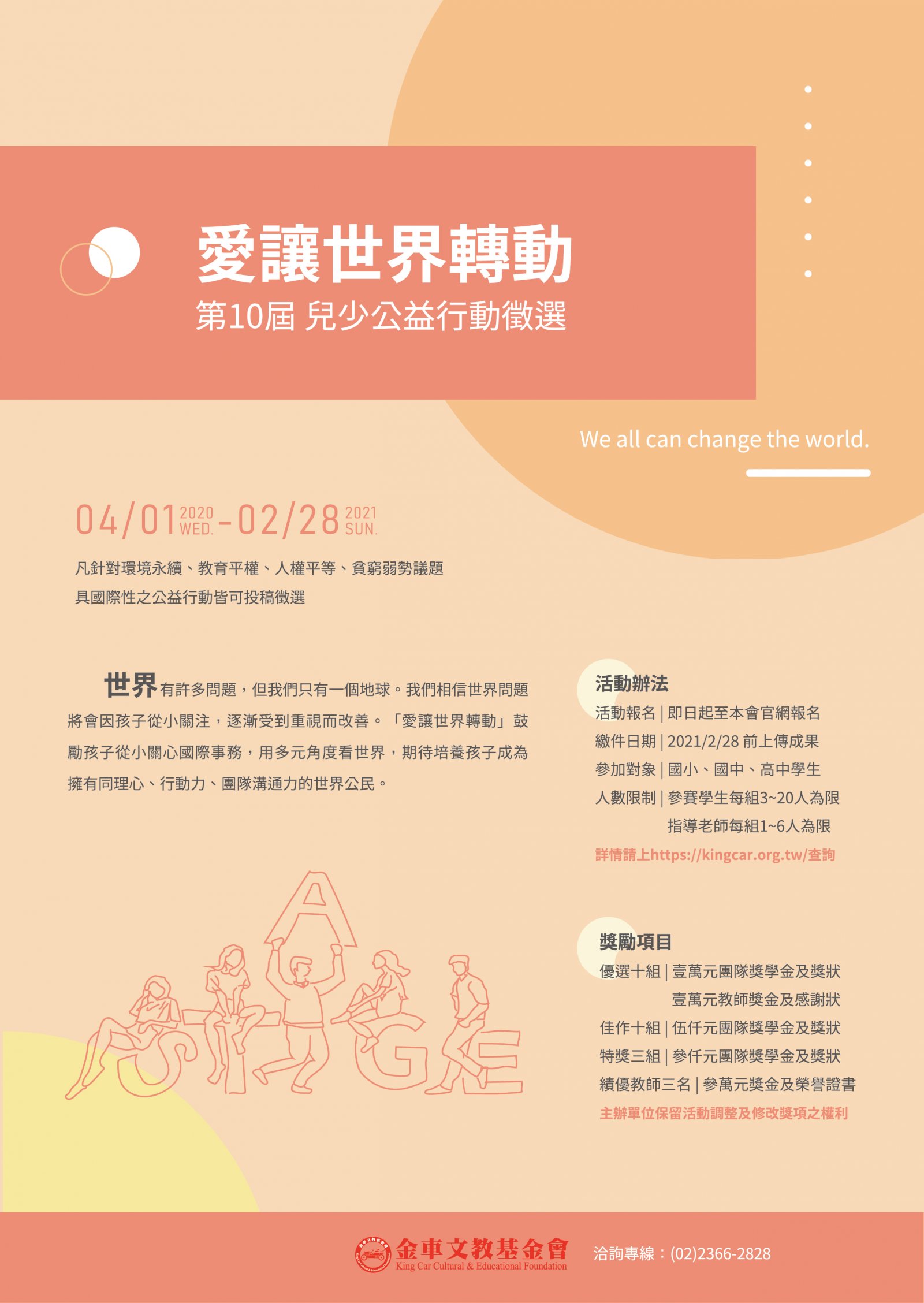 - 「愛讓世界轉動 兒少公益行動」徵選資訊(一)活動對象:國小、國中、高中之學生,團隊人數(3人~20人),以班級、社區、家庭為單位報名。(二)徵選日期:2020年3月1日~2021年2月28日間完成之公益行動皆可參加徵選,請於2021年2月28日(五)前完成報名,並上傳成果表格及照片或影片(詳情請上https://kingcar.org.tw 查詢)。(三)活動獎項:主辦單位可視收件組數保留活動調整及修改獎項之權利。優選十組-壹萬元團隊獎學金、教師指導獎金、獎狀佳作十組-伍仟元團隊獎學金、獎狀特獎三組-參仟元團隊獎學金、獎狀績優教師獎三名-參萬元獎金、證書