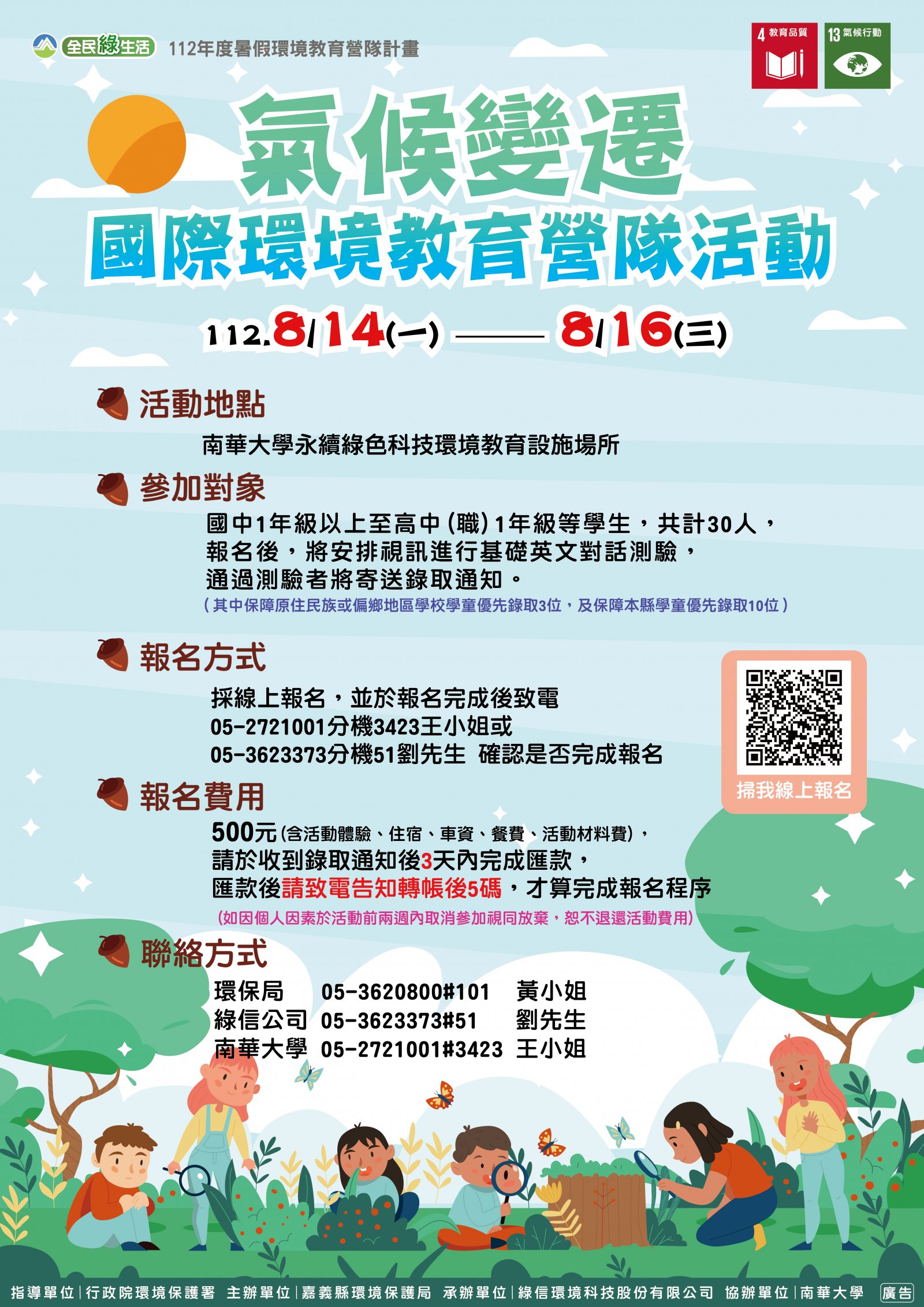 (四) 活動費用:環境教育推廣價500元整,低收入戶免繳。