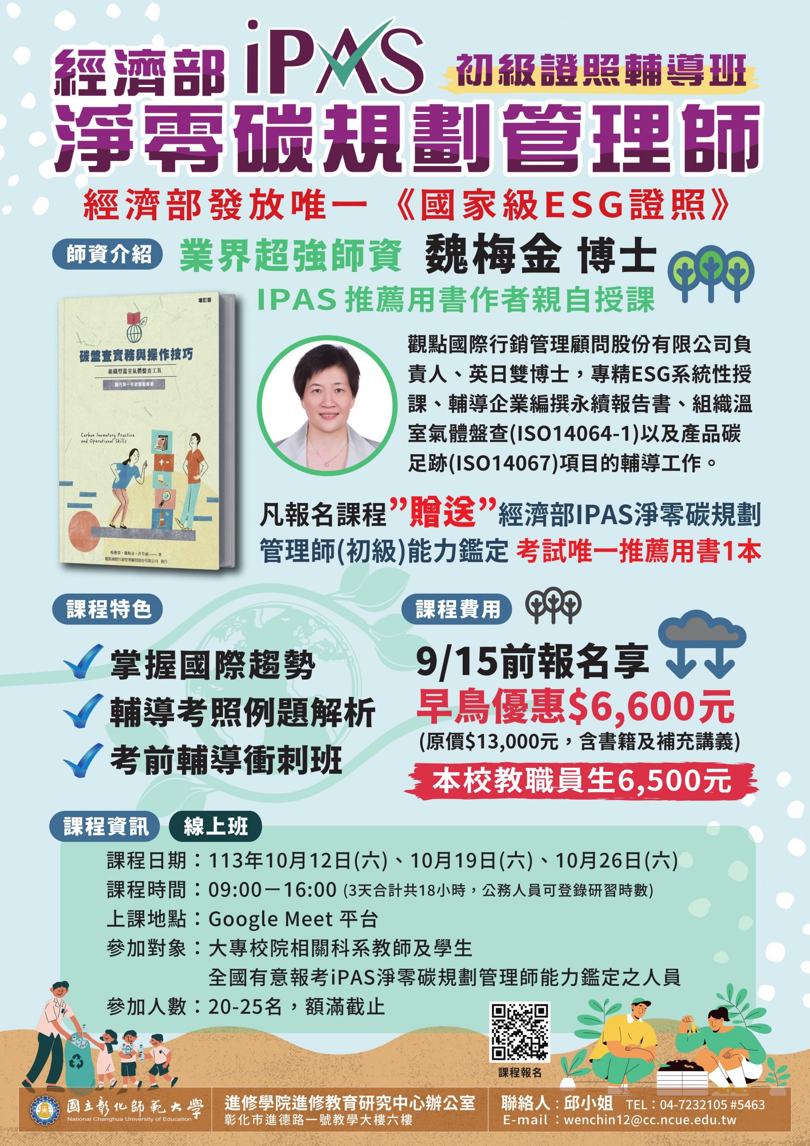 | 一、 | 「113年iPAS淨零碳規劃管理師(初級)能力鑑定輔導班(線上班) 」 |