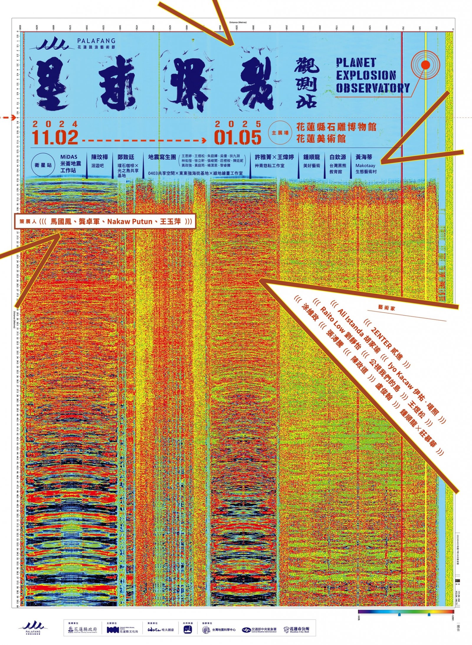 | 第三屆「PALAFANG花蓮跳浪藝術節」於113年11月2日至114年1月5日盛大回歸。本屆藝術節由馬國鳳、龔卓軍、Nakaw Putun、王玉萍共同策展,以「星球爆裂觀測站」為主題,將在花蓮縣石雕博物館及花蓮美術館展出11組藝術家全新創作,並串連8個在地特色空間作為本屆藝術節的衛星站,帶來一系列精彩展覽及體驗活動。本次藝術節主題啟發自0403花蓮強震,探討人在震災後如何面對環境、理解災害及心靈自處,透過與Midas米崙地震觀測站科學團隊合作,也透過藝術創作的轉譯,將斷層破裂的觀測數據,延展到人與自然萬物在星球巨大震盪錯位後的關係重組與存在重逢,歡迎大家來體驗一場沉浸式美術課。 |