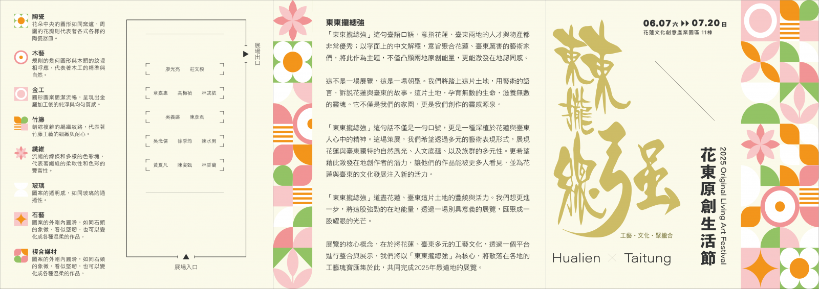 國立臺東生活美學館將於6月7日至7月20日假花蓮市文化創意產業園區第11棟,舉辦「2025花東原創生活節-東東攏總強」特展,展區規劃13位花東工藝師們的原創工藝品展區、工藝師導覽、原創生活市集、音樂彈唱會及手作體驗活動。