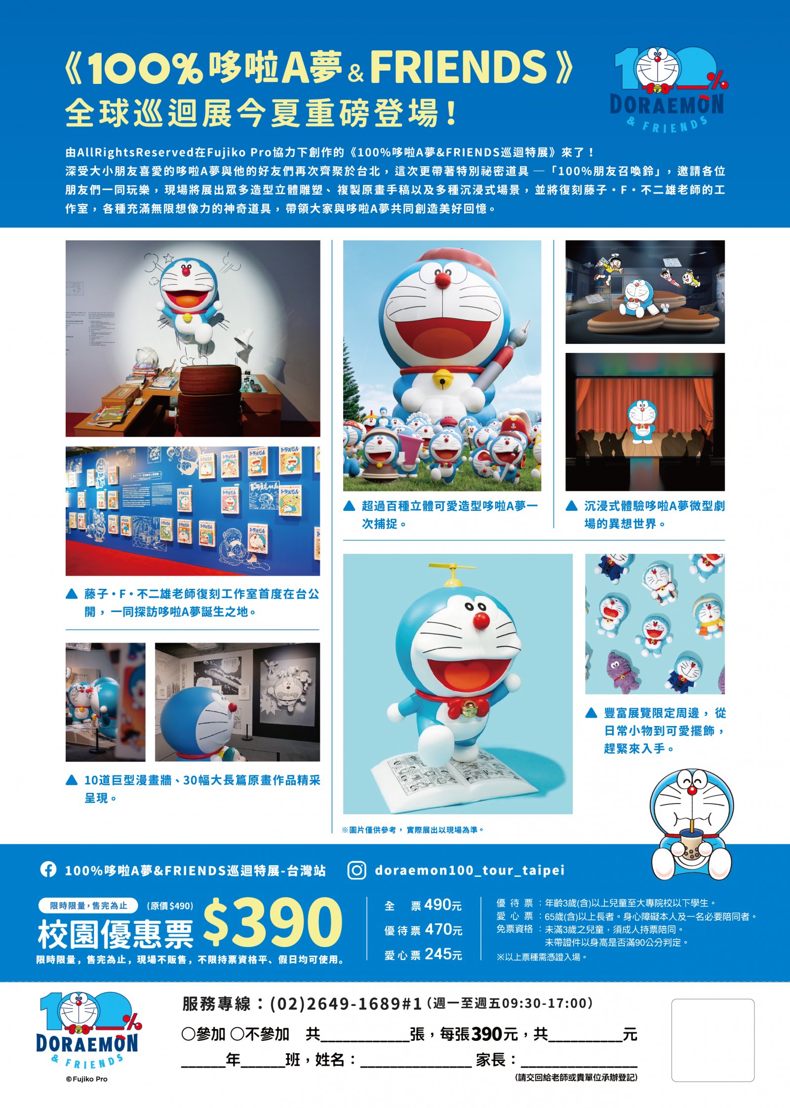 | 一、 | 《100%哆啦A夢&FRIENDS》全球巡迴展今夏登台!深受大小朋友喜愛的哆啦A夢與他的好友們再次齊聚於台北,這次更帶著特別祕密道具─「100%朋友召喚鈴」,邀請各位朋友們一同玩樂,現場將展出眾多造型立體雕塑、複製原畫手稿以及多種沉浸式場景,還將重現藤子・F・不二雄老師的工作室,以及各種充滿無限想像力的神奇道具,帶領大家與哆啦A夢共同來創造許多美好回憶。 |