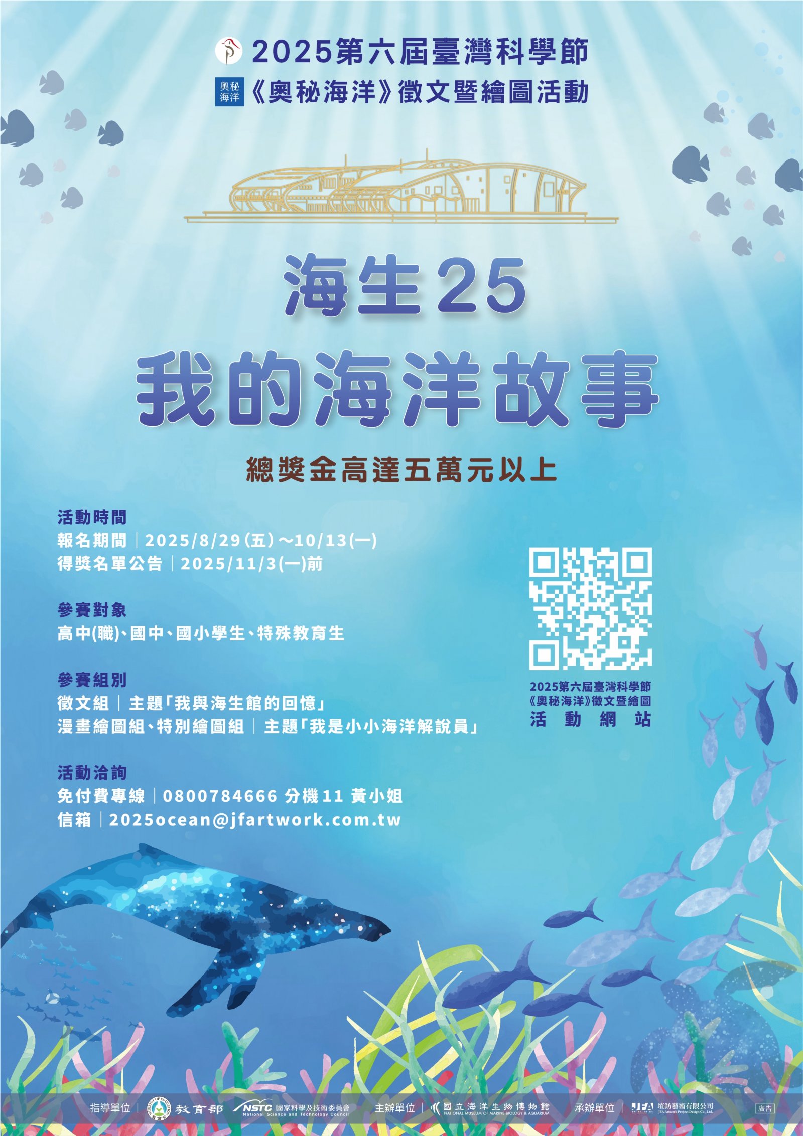 五、如有活動相關疑問請洽承辦小組黃小姐:電話0800-784- 666分機11、信箱2025ocean@jfartwork.com.tw。