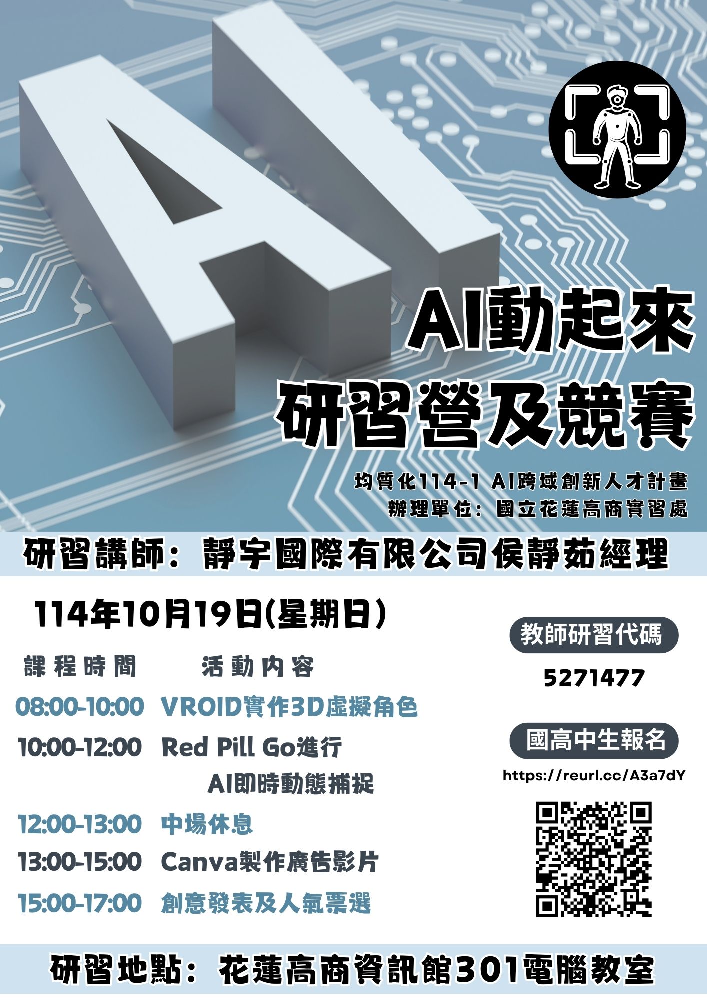 國立花蓮高級商業職業學校辦理114學年度第1學期均質化「AI動起來研習營及競賽」活動,鼓勵有興趣者報名參加。