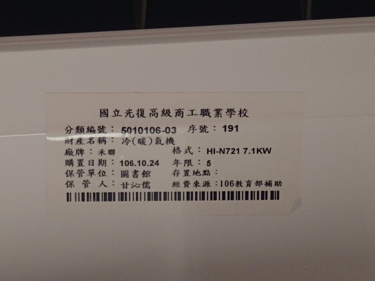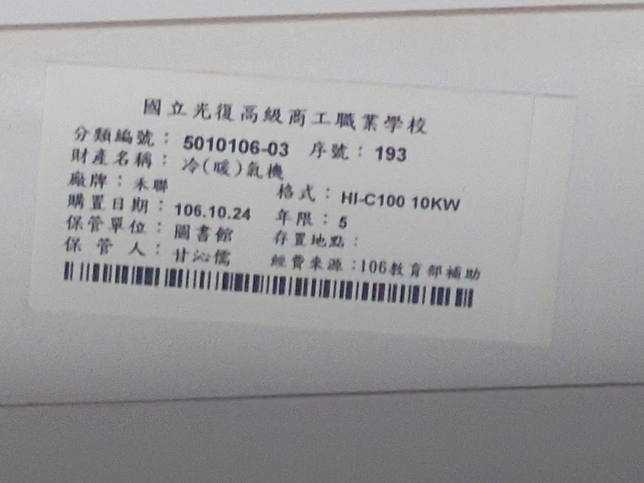圖書館 2 樓閱覽室冷氣 HERAN 最左邊最右邊各一台