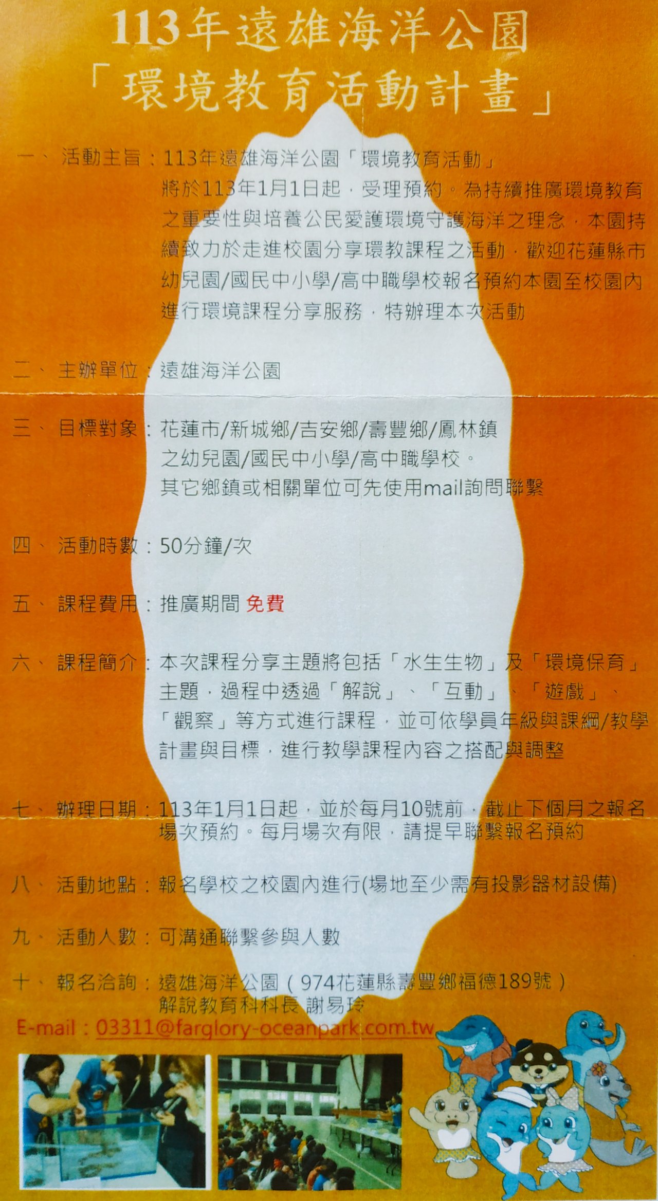 113年遠雄海洋公園「環境教育活動計畫」可申請參加免費推廣課程,各班如有需求請提出。