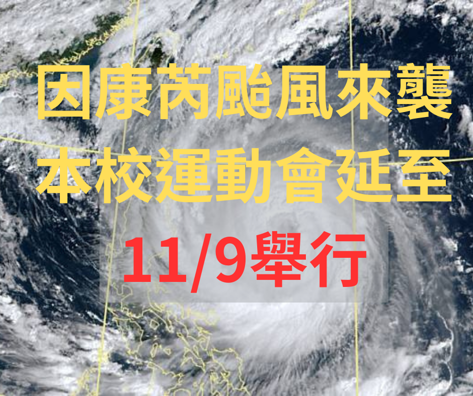1.本校運動會受康芮颱風影響延至 11 月 9 日(周六)舉辦,原定 11 月 4 日補假因 11 月 2 日運動會 已延期,依規定改為上班上課, 行事曆修改為 11 月 9 日(週六)運動會,補假日一併改為 11 月 11 日(周一)不上班不上課!