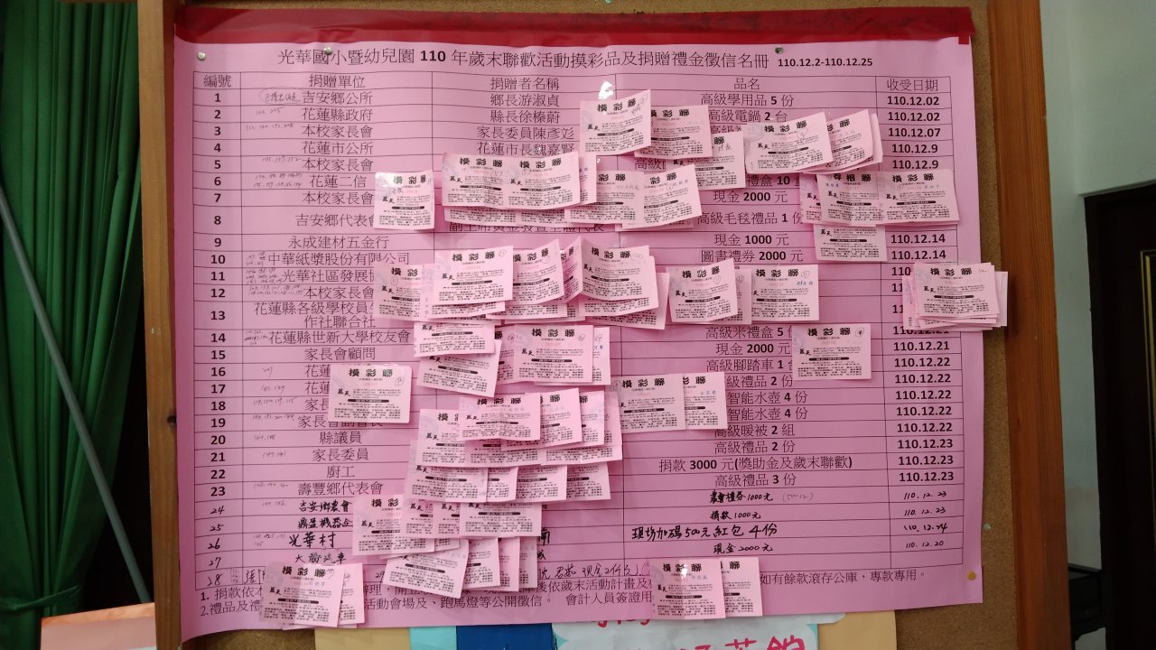 光華國小暨幼兒園110年歲末聯歡活動摸彩品及捐贈禮金徵信名冊 110.12.2-110.12.25