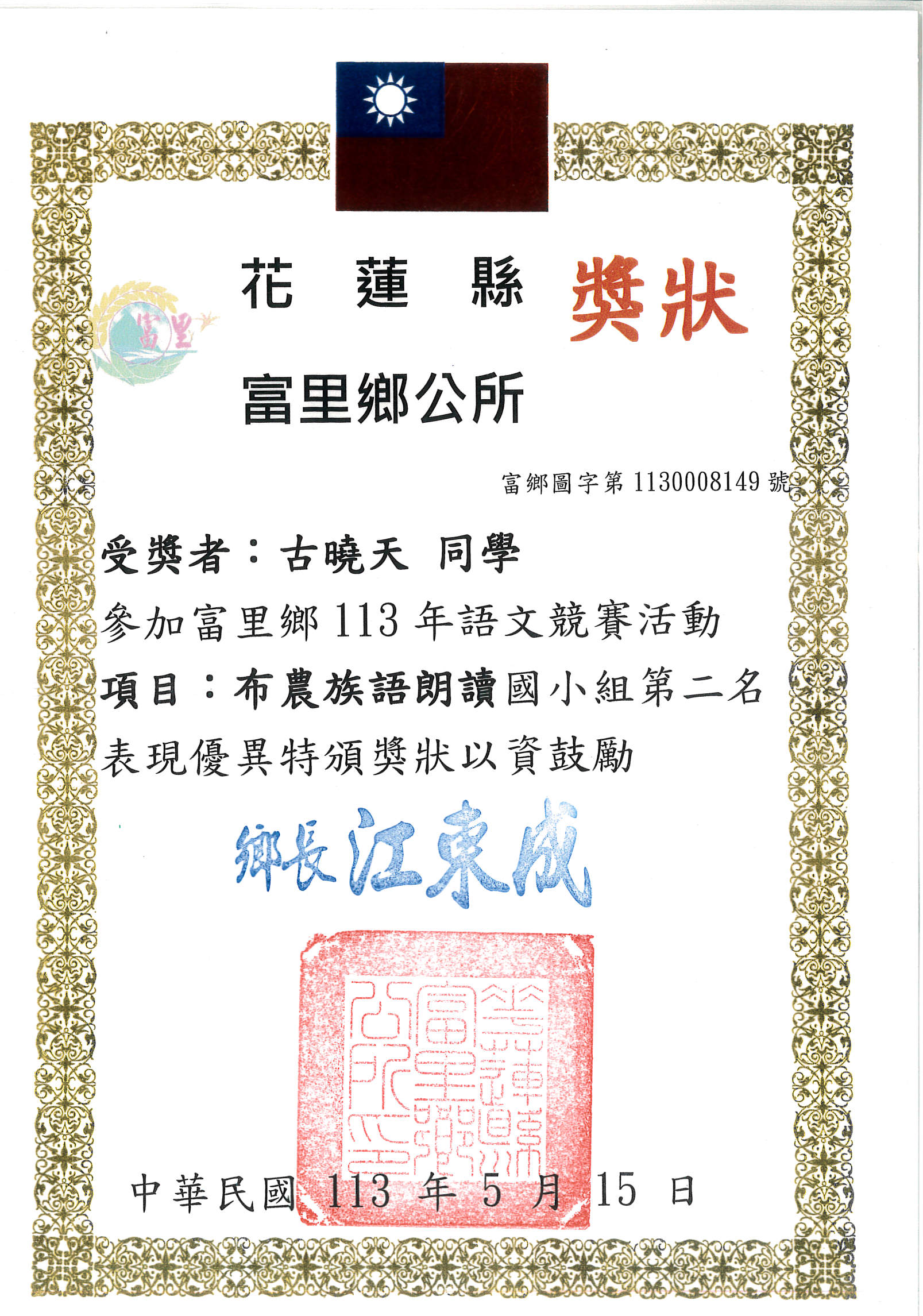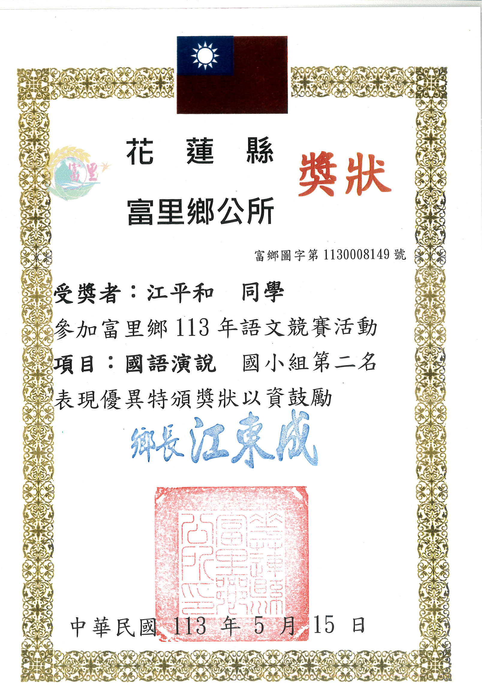 113年富里鄉語文競賽校內頒發獎狀