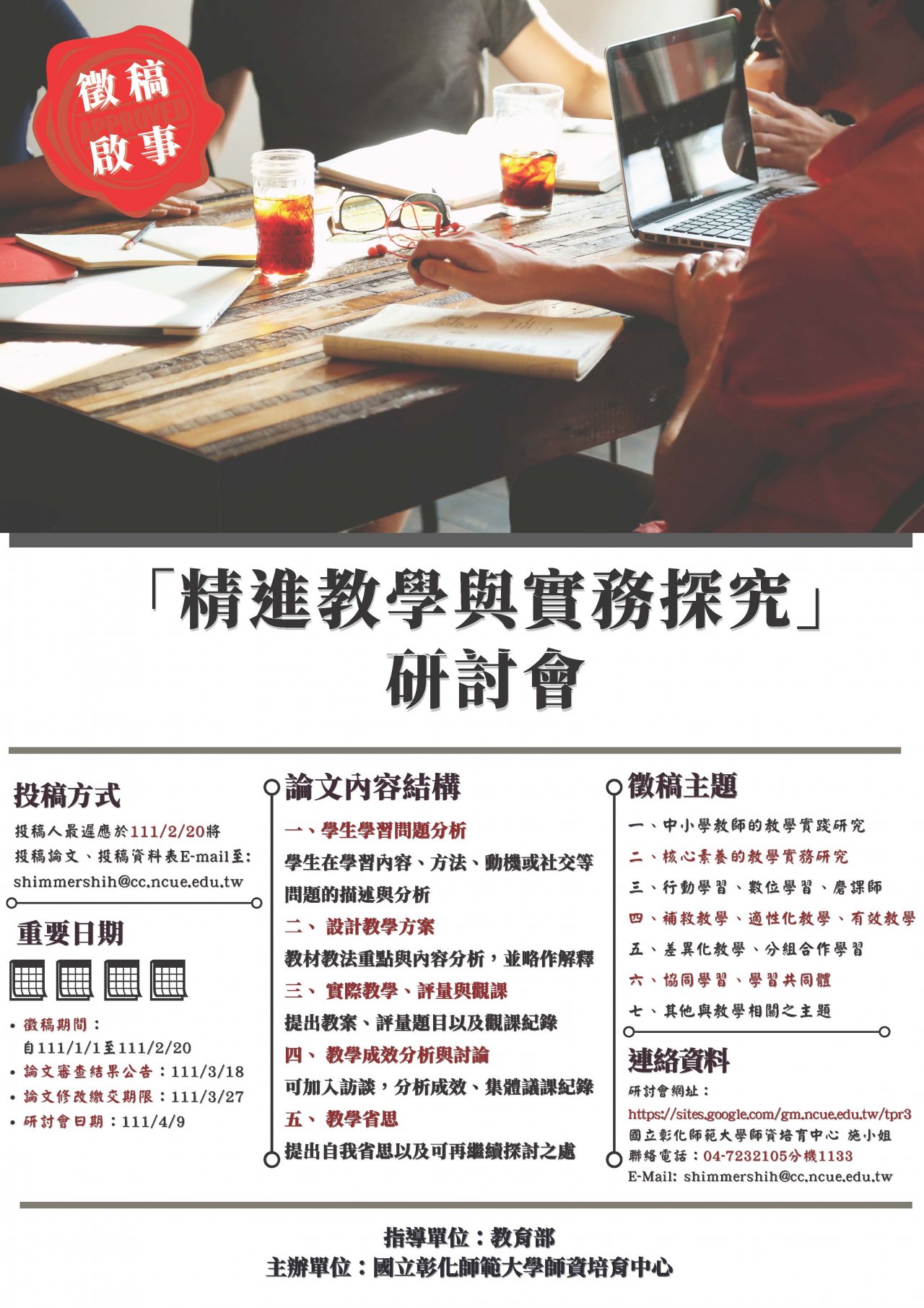 | 五、 | 檢附徵稿公告一份,詳情請至國立彰化師範大學資培育中心研討會網站查詢(https://sites.google.com/gm.ncue.edu.tw/tpr3/)。 |