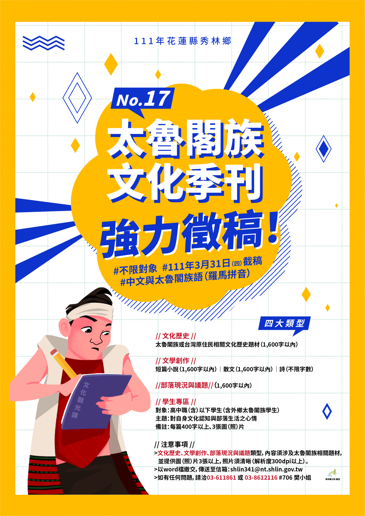 新詩(不限文字及圖(照)片數量,內容須與太魯閣族相關之題材)。 |