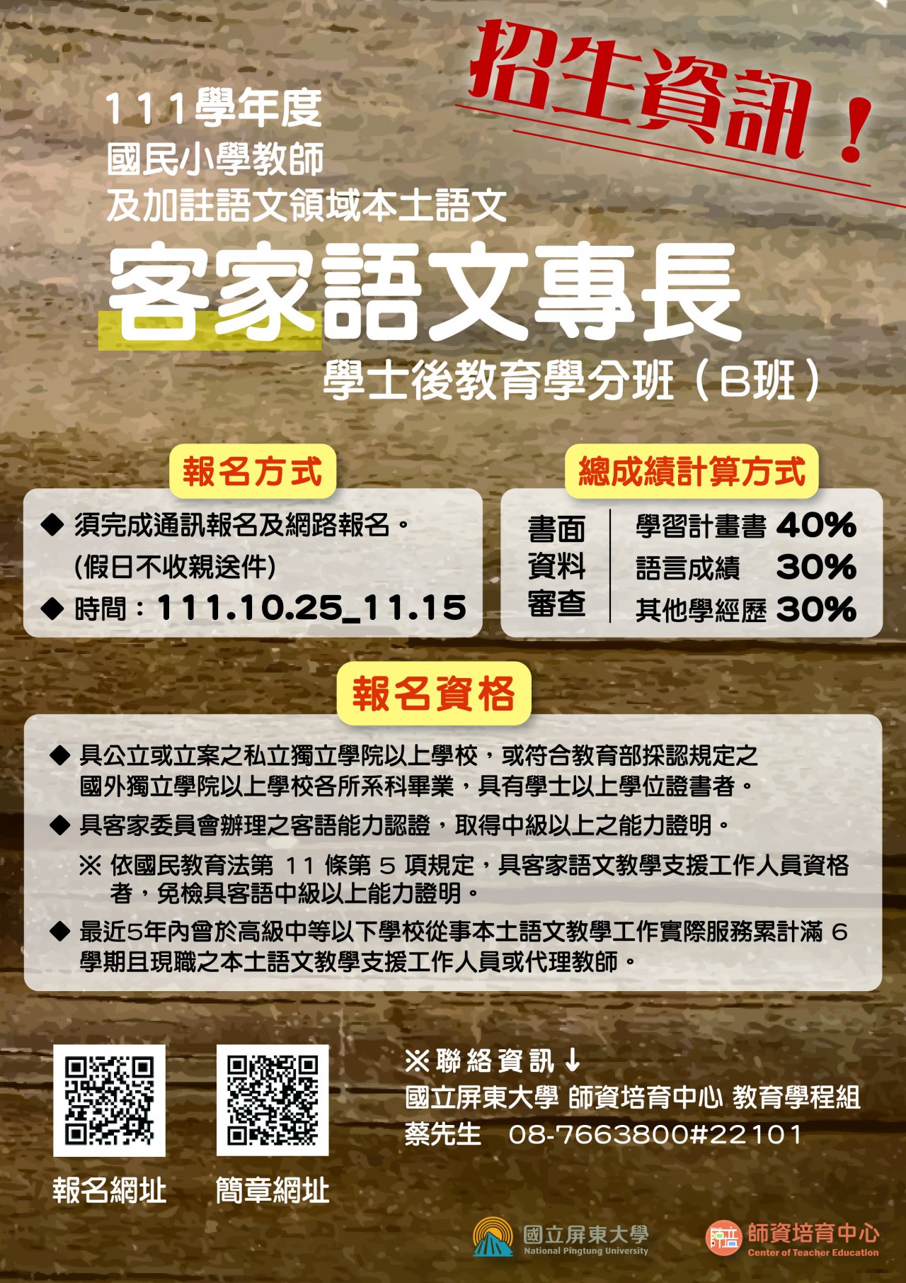 五、 聯絡資訊:國立屏東大學師資培育中心教育學程組蔡先生,電話:( 08 ) 766-3800 分機 22101 。