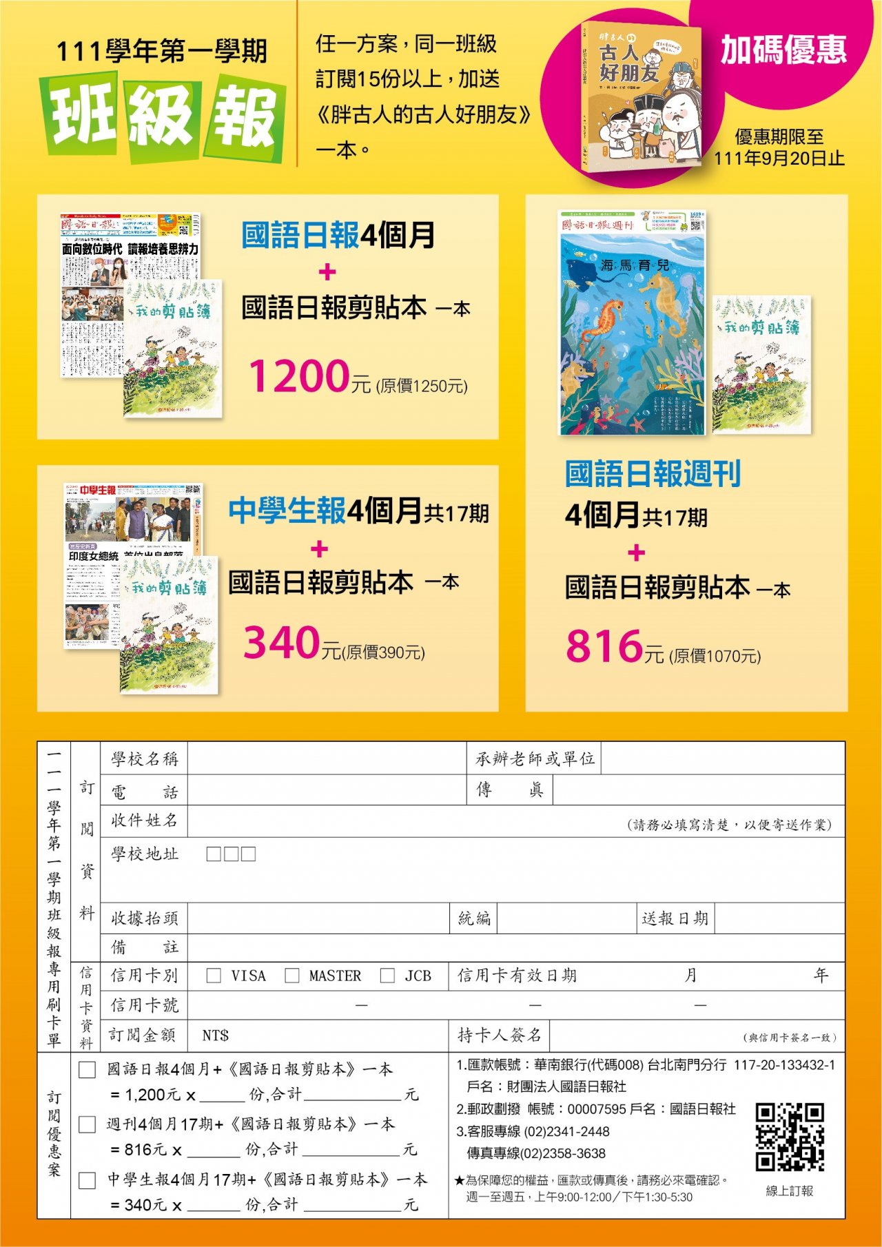 | 一、 | 本社即日起推出「111-1 學期班級報」優惠訂閱專案,此案訂閱期間為 4 個月。 |