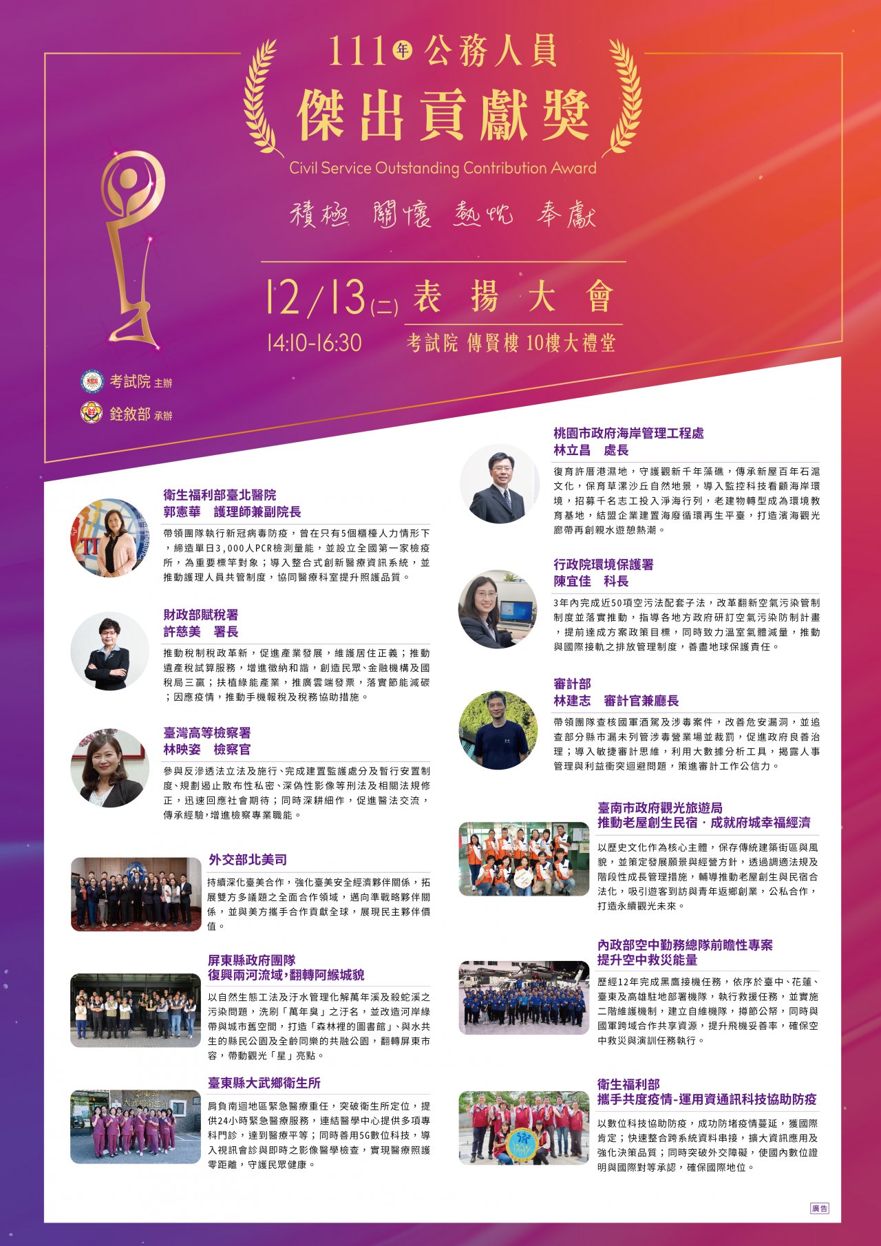 一、本( 111 )年公務人員傑出貢獻獎業經考試院組成評審委員會評選出 6 名得獎人及 6 組得獎團體。為表揚得獎者傑出事蹟,考試院訂於本年 12 月 13 日(星期二)下午 2 時 10 分於考試院傳賢樓 10 樓大禮堂舉行表揚大會,並同步辦理 Facebook 網路線上直播。