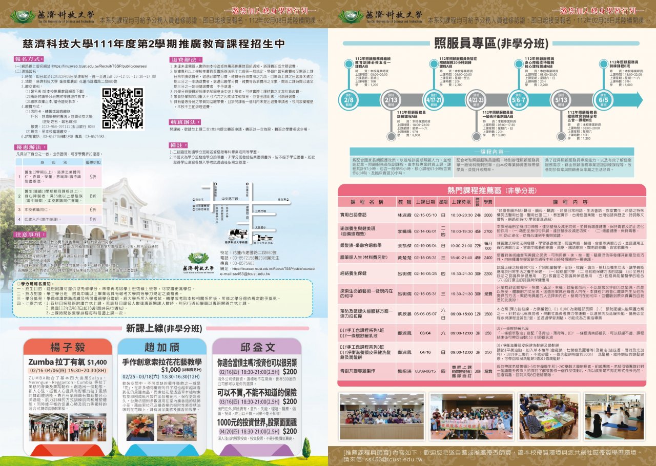 如需獲知詳細之招生訊息及報名表請至慈濟科技大學進修推廣部網 頁查詢或下載。.