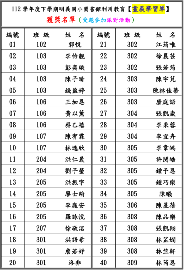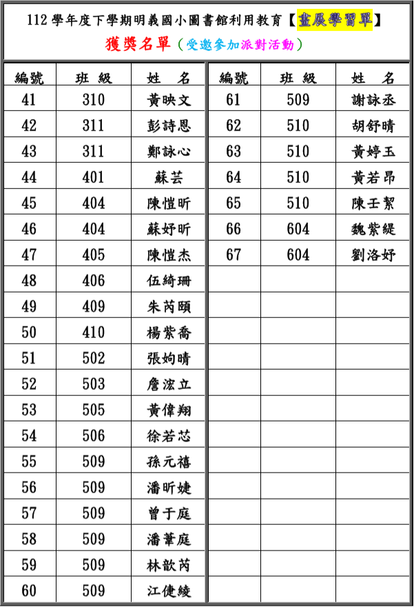 名單內獲獎學生的學習單