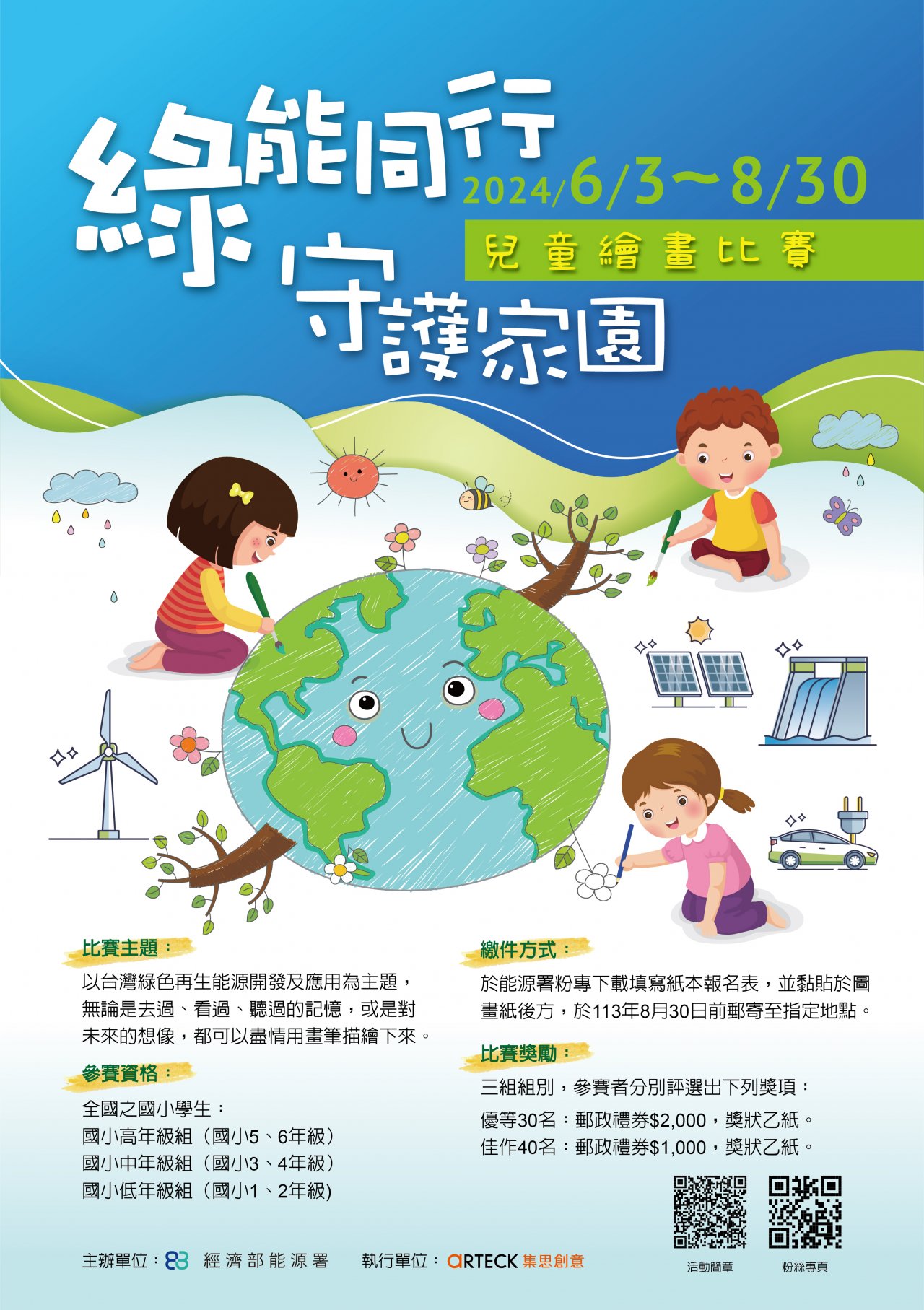 | 二、 | 綠能發展不僅提升我國能源自主性,及改善環境品質,為下一代奠定能源永續發展之基礎,經濟部能源署舉辦 2024「綠能同行 守護家園」兒童繪畫比賽,鼓勵兒童以各式發展中之綠能為靈感,運用色彩及線條等彩繪方式,展現無限想像力及創造力。 |