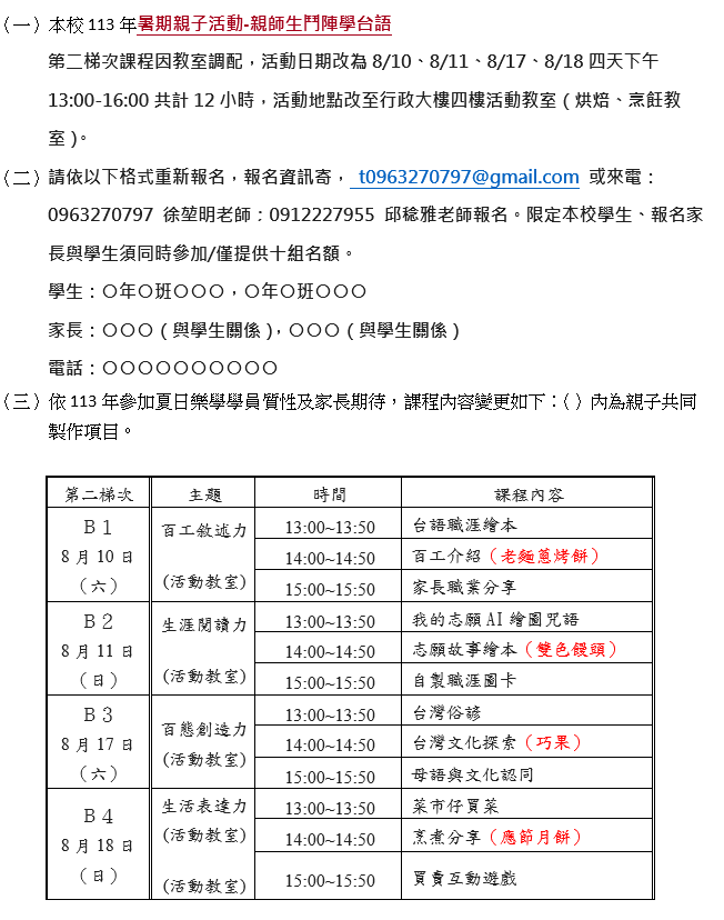 • 請依以下格式重新報名,報名資訊寄, t0963270797@gmail.com 或來電: 0963270797 徐堃明老師; 0912227955 邱稔雅老師報名。限定本校學生、報名家長與學生須同時參加/僅提供十組名額。