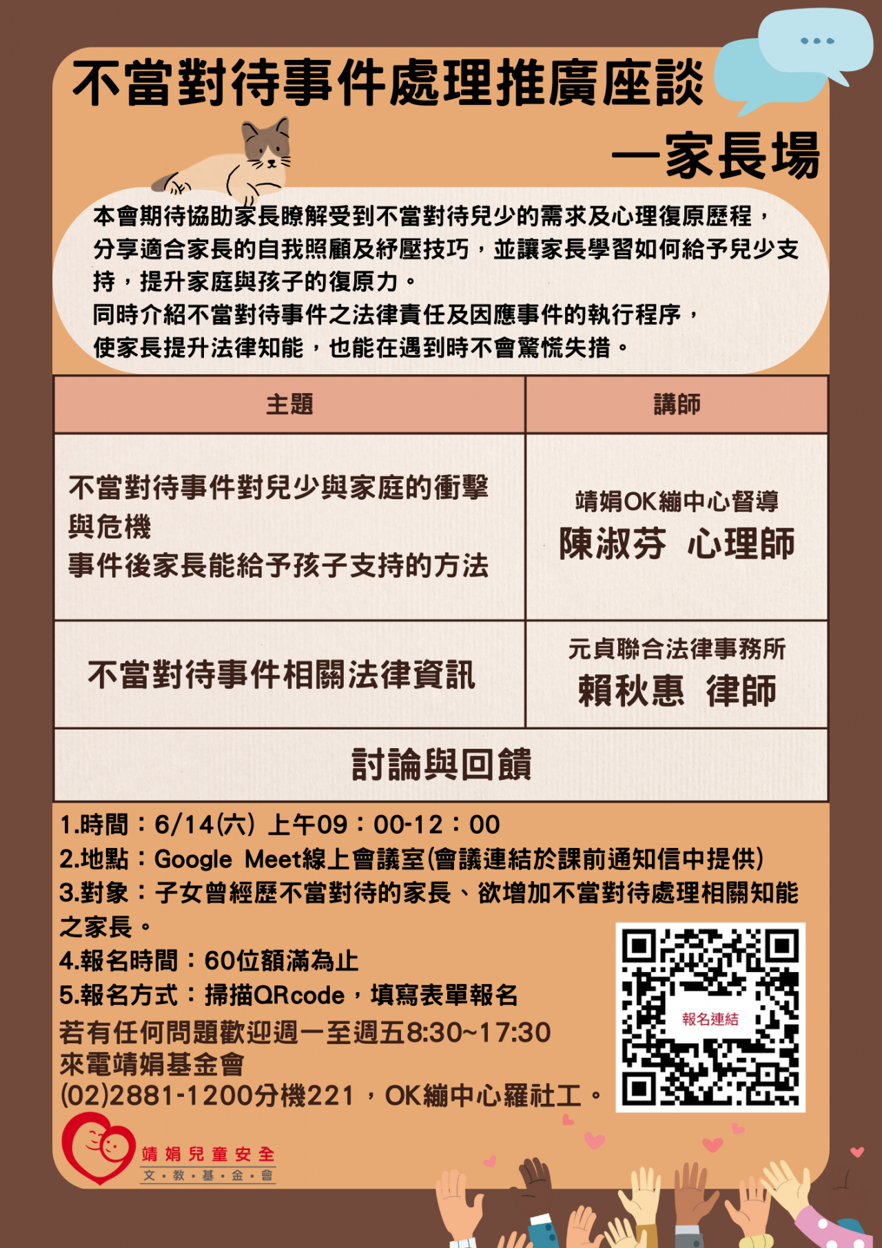 二、 財團法人靖娟兒童安全文教基金會期待以座談的方式與家長分享受到不當對待兒少的需求、心理復原歷程及適合家長的自我照顧、紓壓技巧,並讓家長學習如何給予兒少支持,提升家庭與孩子的復原力。同時介紹不當對待事件之法律責任及因應事件的執行程序,使家長提升法律知能,也能在遇到時不會驚慌失措。