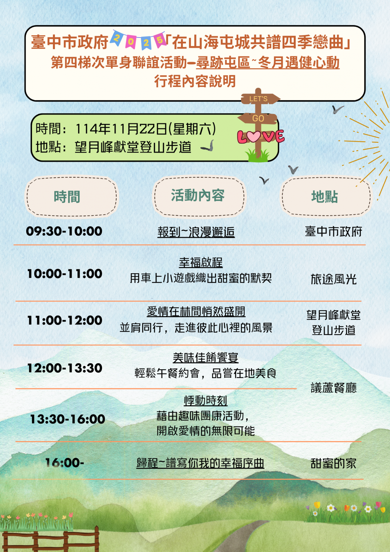 - 辦理方式:健行--一起走,一起聊,一起遇見對的人。