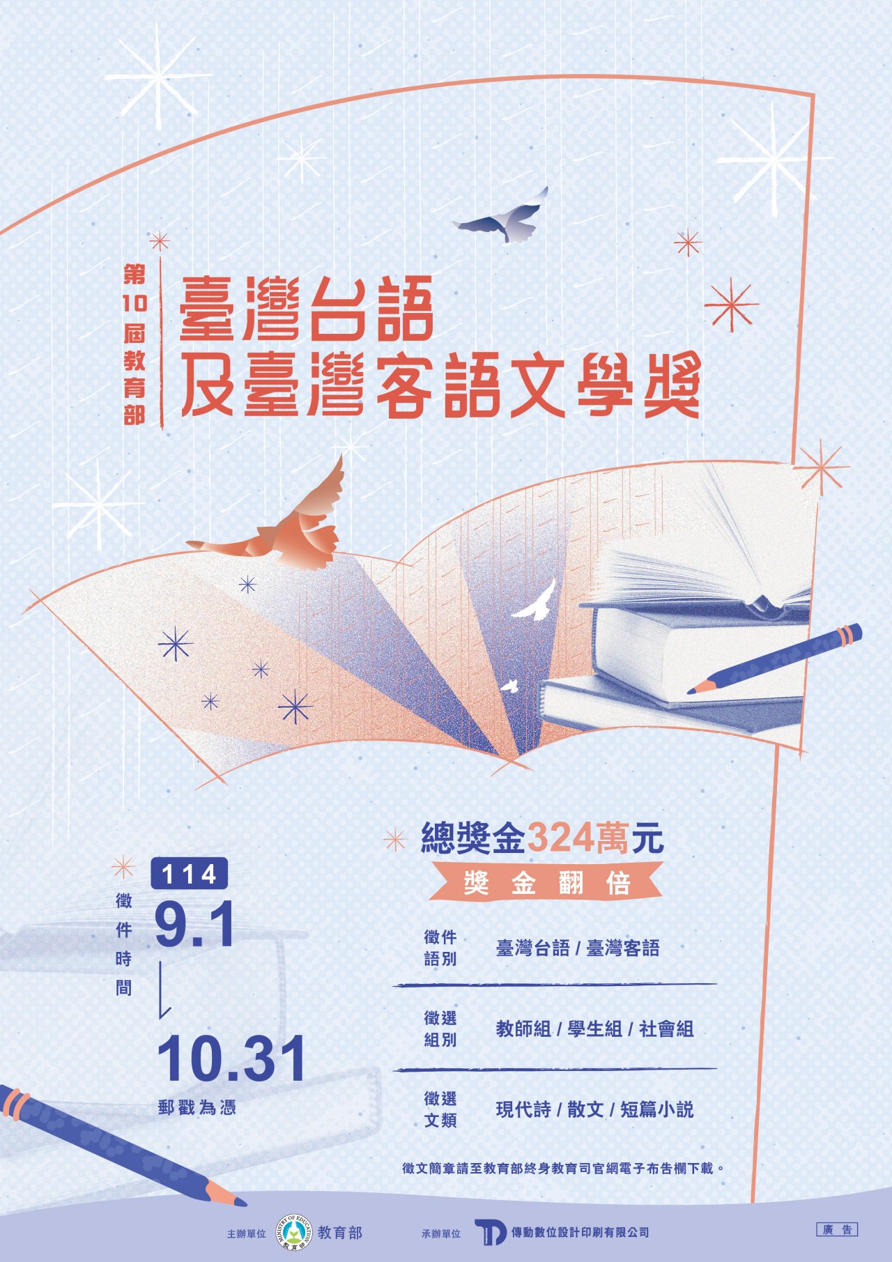 即日起至 114 年 10 月 31 日止,詳情及徵文簡章下載請至教育部終身教育司網站( https://depart.moe.edu.tw/ED2400/Default.aspx
