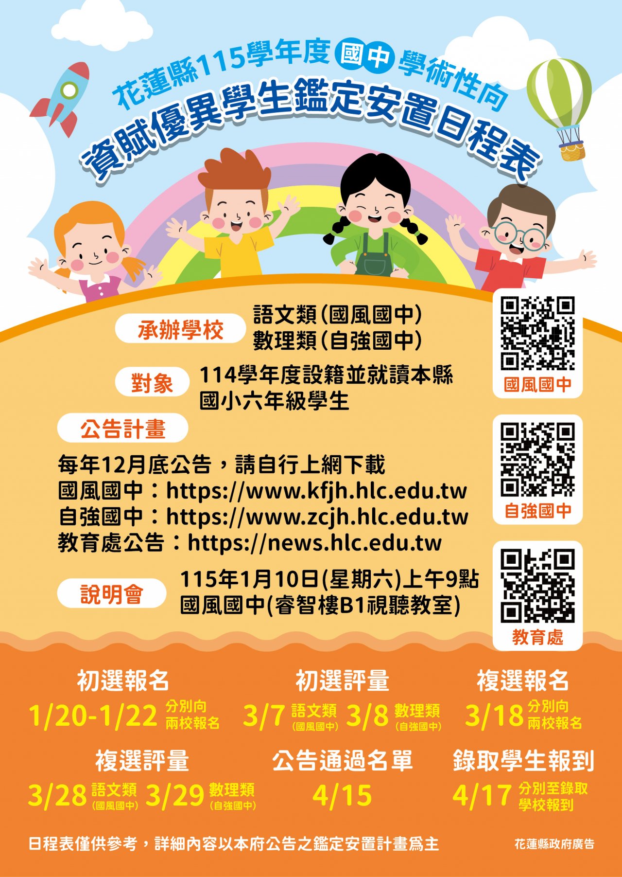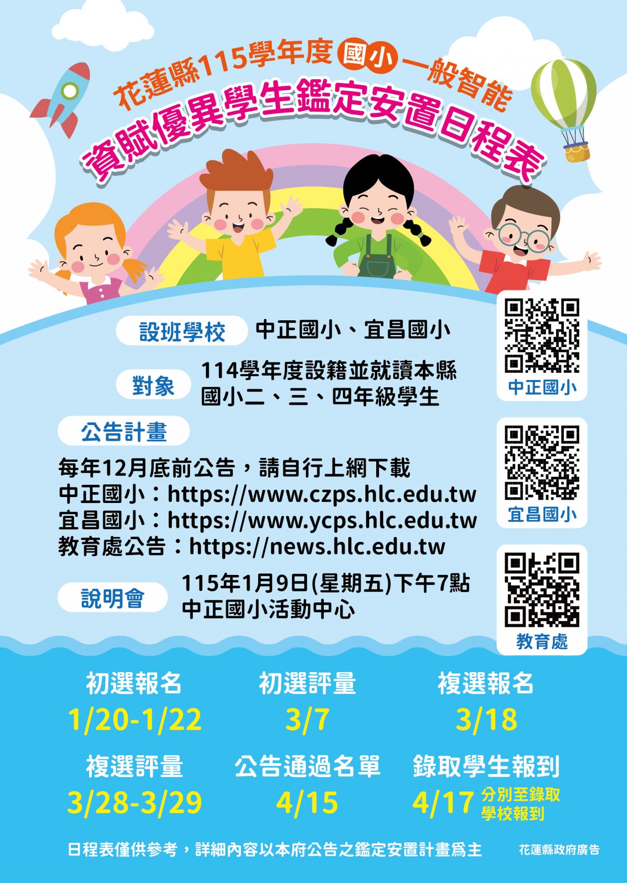 公告花蓮縣 115 學年度國小一般智能資優鑑定及國中學術性向資優鑑定日程表及鑑定安置計畫