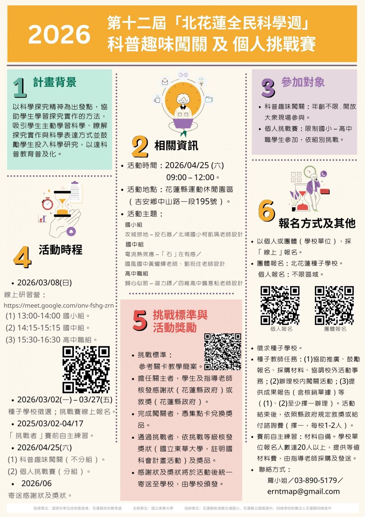國立東華大學辦理 2026 年第十二屆「北花蓮全民科學週」科普趣味闖關及個人挑戰賽,相關資訊如下: