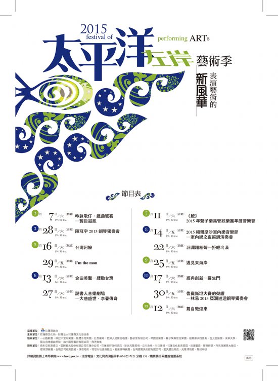 | 一、 | 「2015 太平洋左岸藝術季」為本局主辦 104 全年度總計 13 場售票演出,票價 200 至 500 元不等,由兩廳院售票系統代售。 |