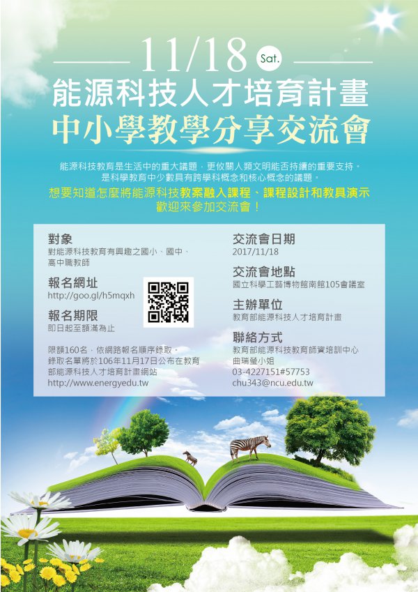 | 三、 | 報名期間:即日起至額滿為止,限額 160 名,僅接受線上報名,報名網址: http://goo.gl/h5mqxh ,錄取名單將於 11 月 17 日公告於教育部能源科技人才培育計畫網站(http://www.energyedu.tw)。 |