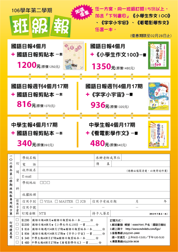 一、 本社即日起推出「106-2 學期班級報」優惠訂閱專案,此案訂閱期間為 4 個月。