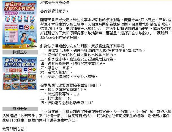 各位同學:同學漸趨炎熱,從事水上活動,請務必注意個人安全!