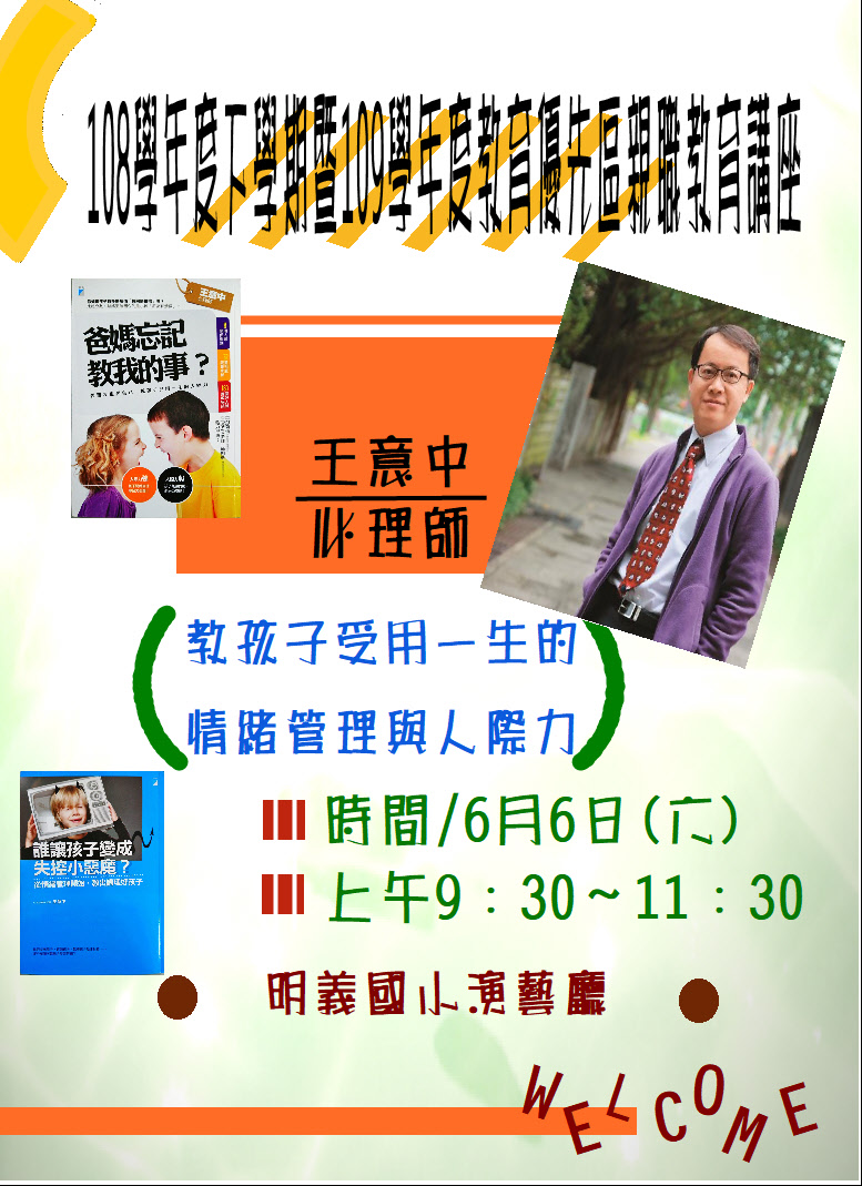 109年6月6日(六)上午教育優先區親職教育講座暨教師輔導知能研習,請有意願參加的同仁至教師在職進修網站報名,並請準時出席。謝謝合作!
