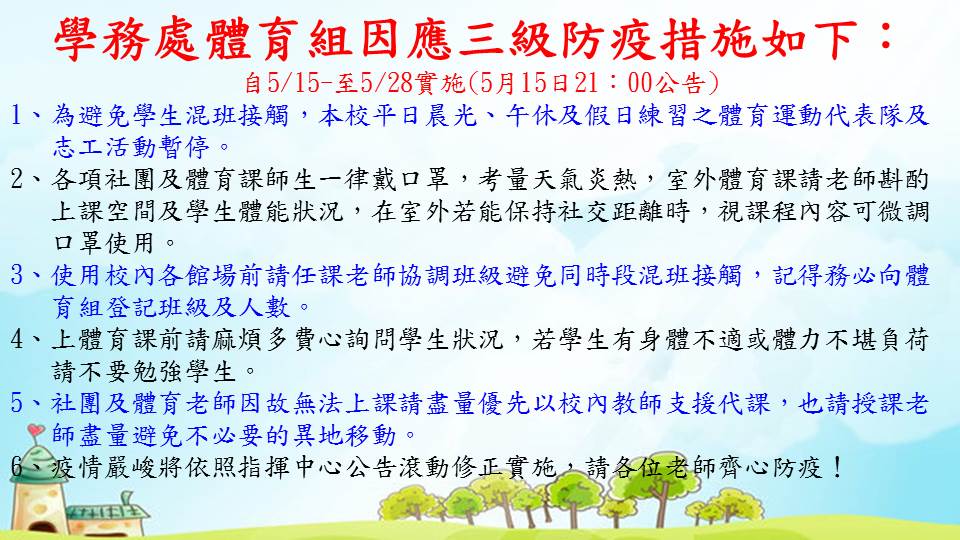學務處體育組因應三級防疫措施如下:自 5/15-至 5/28 實施(5 月 15 日 21 : 00 公告)