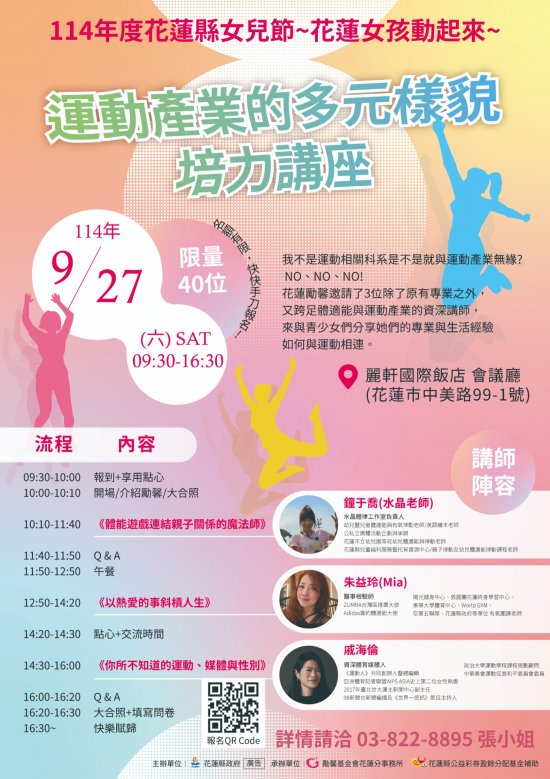 | 二、 | 為提升青少女將運動融入生涯與職涯規劃之認識與關注,該會將於 114 年 9 月 27 日舉辦「運動產業的多元樣貌培力講座」,並邀請水晶體律工作室負責人鐘于喬老師 、 ZUMBA 台灣推廣大使朱益玲老師及資深體育記者戚海倫小姐擔任講師。 |