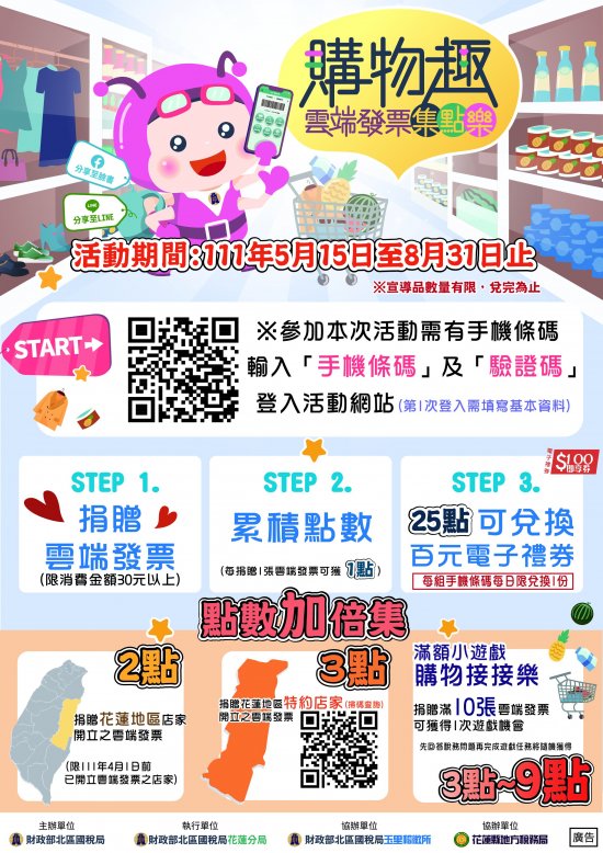 主旨: 本分局於 111 年 5 月 15 日起至 8 月 31 日舉辦「購物趣~雲端發票集點樂」雲端發票線上活動,藉以鼓勵民眾購物消費使用載具索取雲端發票,請貴機關協助轉知所屬單位及同仁並放置於 FB 粉絲團、官網、 LINE 、跑馬燈及電視牆等推廣,至紉公誼。