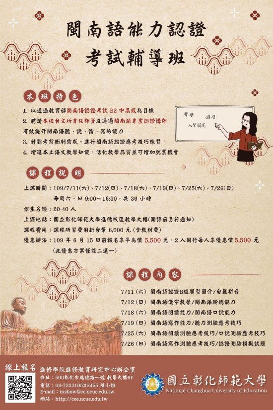 一、課程特色:該班以通過教育部閩南語認證考試 B2 中高級為 目標,聘請該校台文所專任師資及通過閩南語認證專業講 師,有效提升閩南語聽、說、讀、寫的能力。