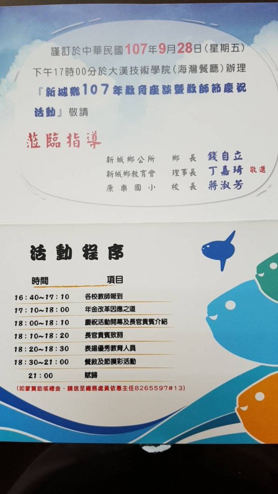 新城鄉教育會訂於 107 年 9 月 28 日(星期五)下午 17 時假大漢技術學院(海灣餐廳)辦理新城鄉 107 年教育座談暨教師節慶祝活動,歡迎各位同仁參加餐敘;新城鄉教育會會員可參加摸彩。